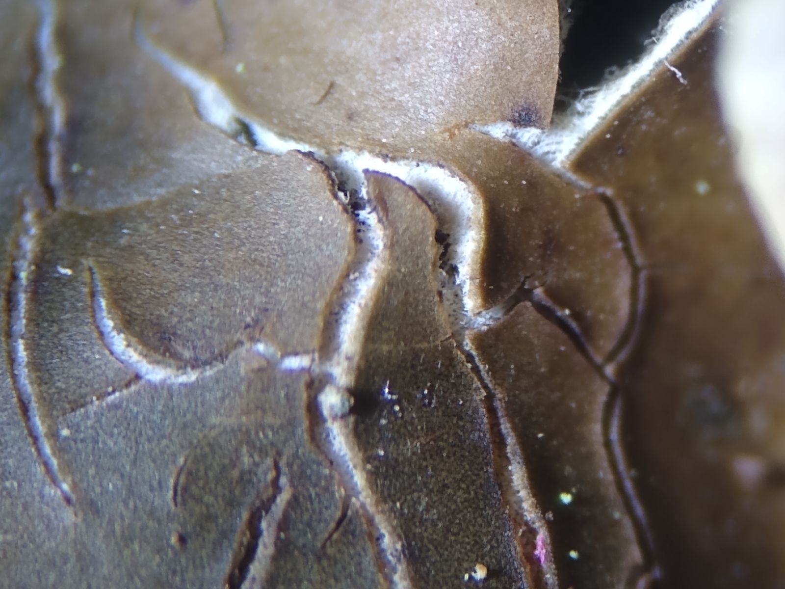 Die Unterseite ist randlich hell (leicht bräunlich) und rhizinienfrei, die Adern nur angedeutet.