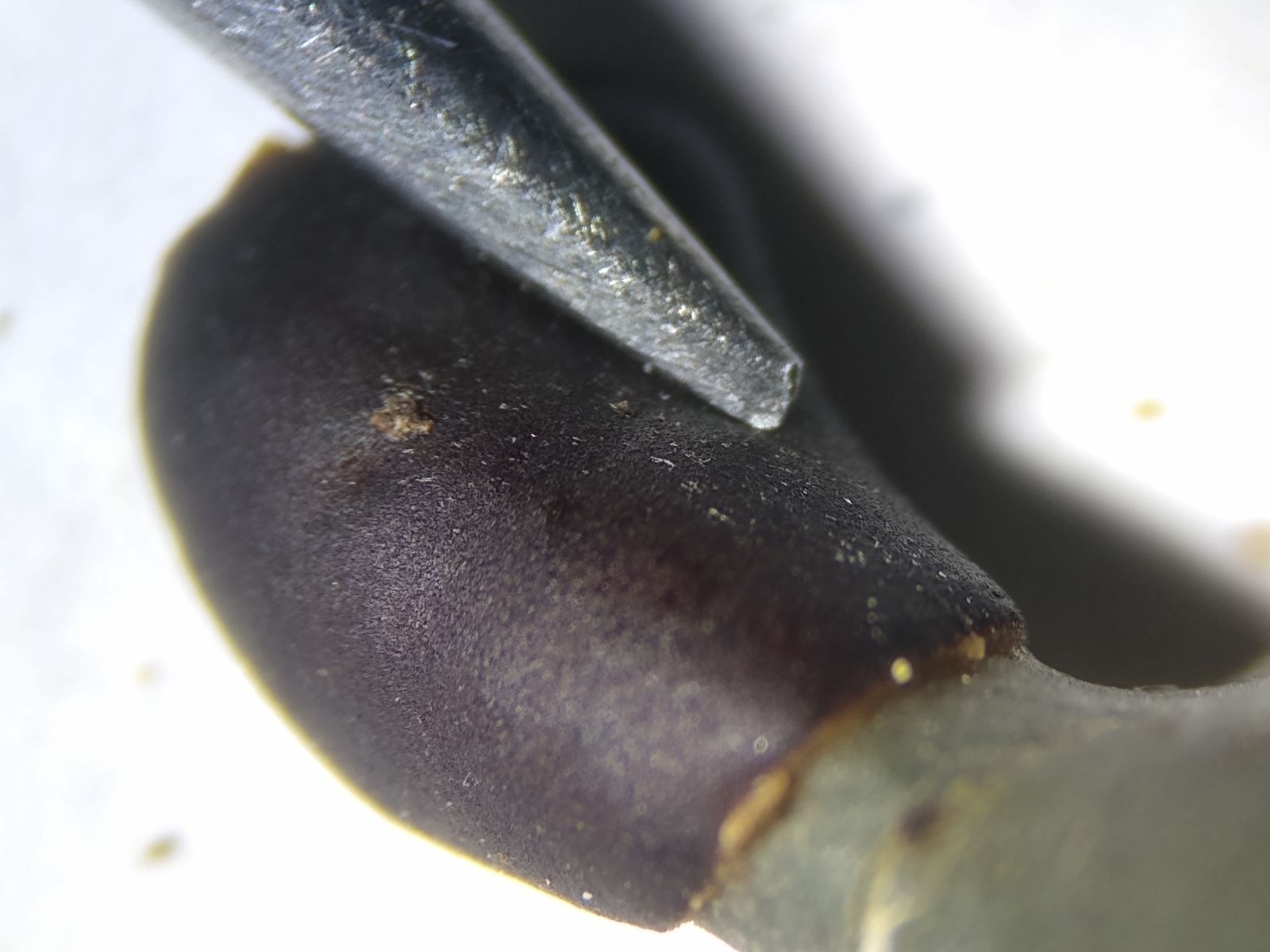 Handelt es sich um eine P. hymenina mit ockerfarbenem Rand auf der Unterseite und extrem dunklen Apothecien?