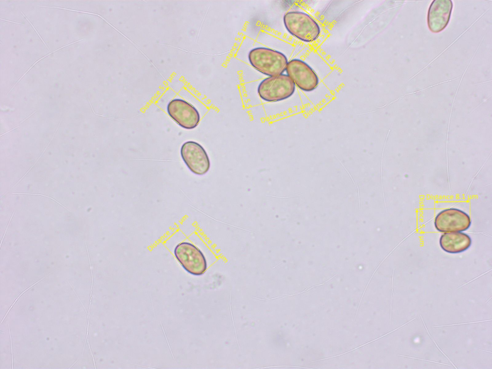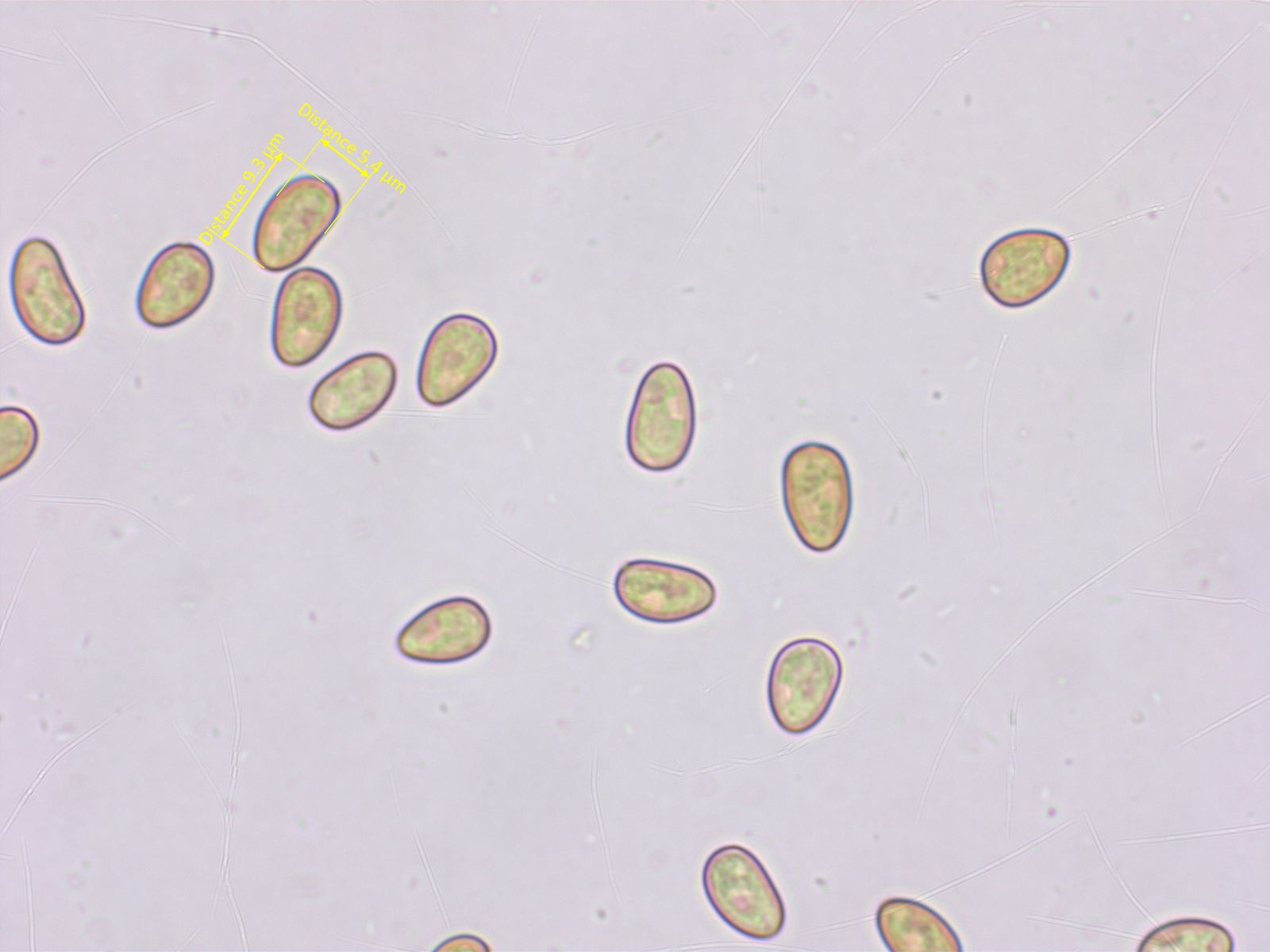 Sporen meist eiförmig, manchmal fast etwas konisch. 7.9-8.8-9.7 x 5.1-5.5-6.3 µm, Q = 1.48-1.60-1.83 (n=20)