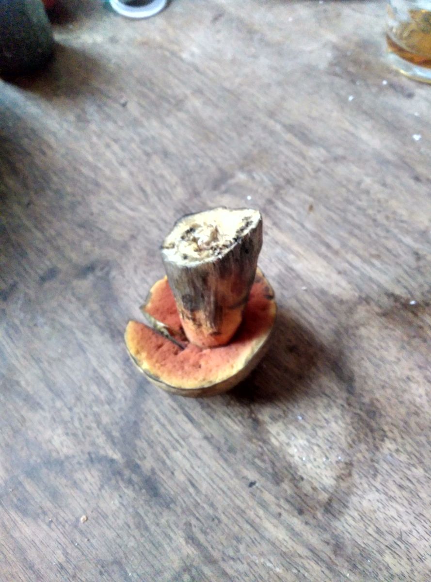 Beschreibung: Feste Struktur, rot / oranger Schwamm, färbt sich sofort blau/grün, wenn angeschnitten.
