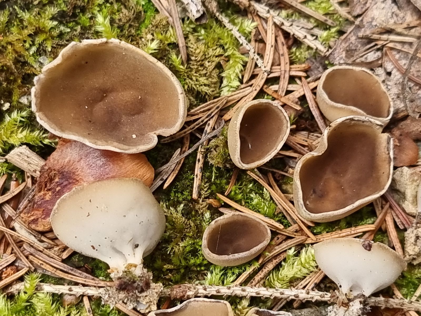 10. Länglichsporige Lorchel - Helvella oblongispora cf., unter einer einzelnen Fichte am Wegesrand. Schwieriger Pilz. Glaubt man zunächst an einen Becherling, erinnert er von unten sofort an die hochgerippte Becherlorchel.