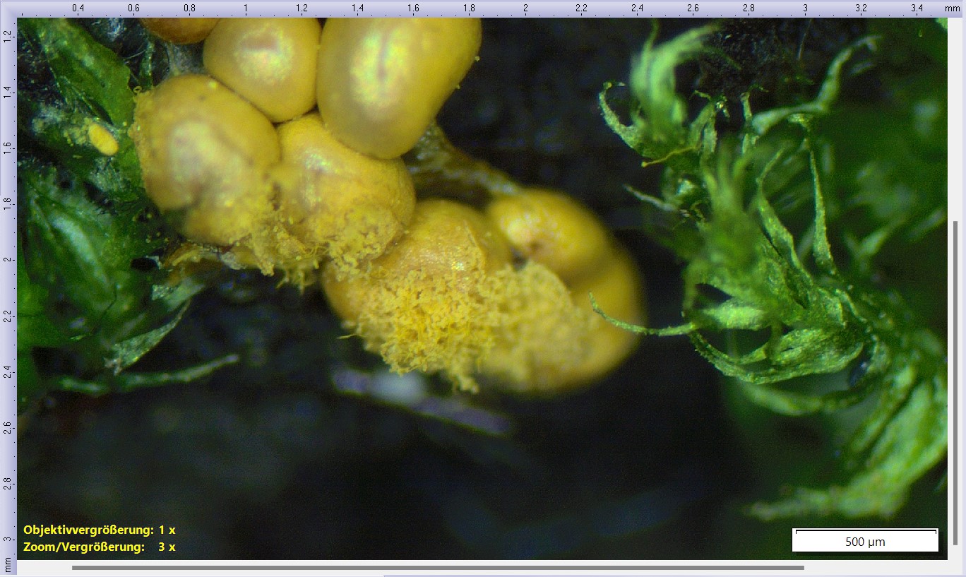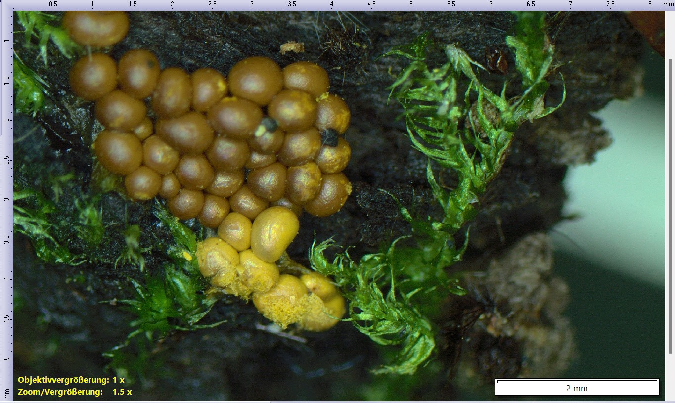 Ich habe hier noch so nebenbei, wenn man zuhause unter dem Stero genauer ein morsches Holz mit Moos untersucht -> Trichia affinis / Gelber-Neststäubling gefunden.