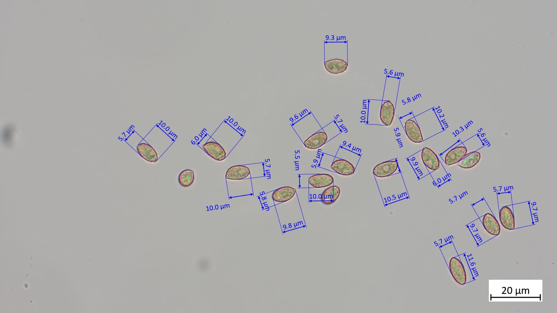 Ich habe noch 16 Sporen gemessen: 10.0 µm (9.3 - 11.6 µm) x 5.8 µm (5.5 - 6.0 µm), Q = 1.74 (1.59 - 2.03)