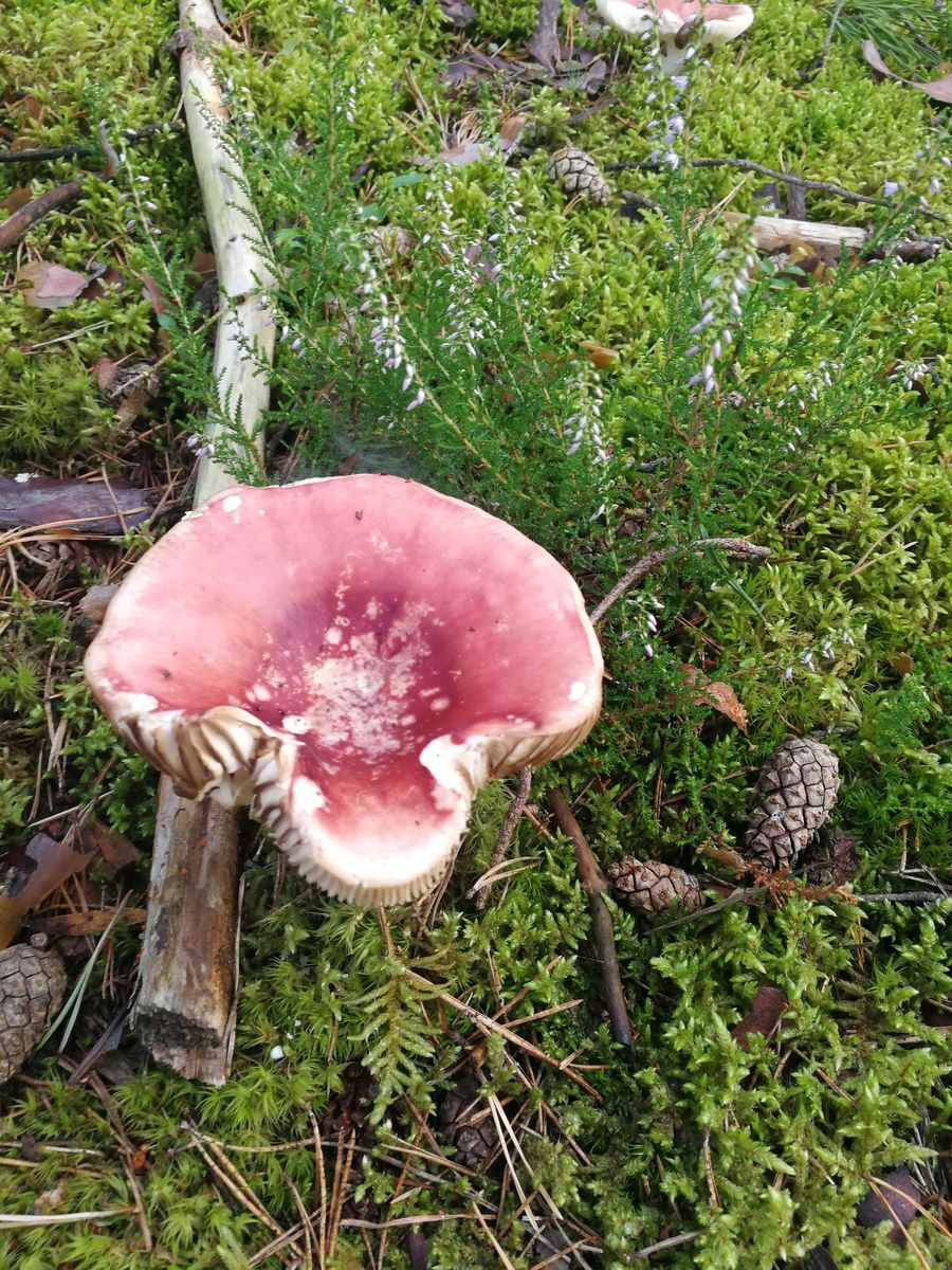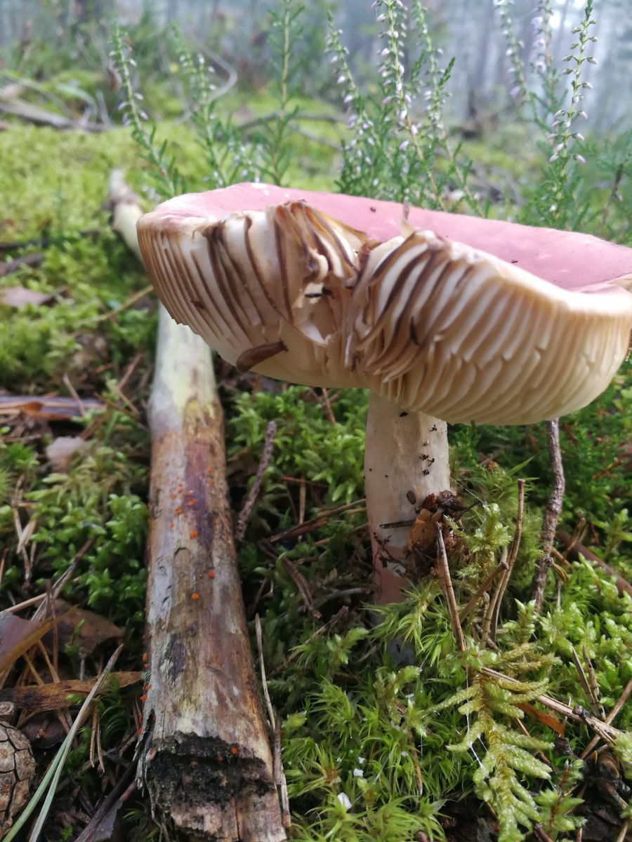 3.Ein schöner roter Täubling, der unbestimmt bleibt. Auf dem Ast daneben ist ein orangefarbener Gallertpilz oder sowas erkennbar
