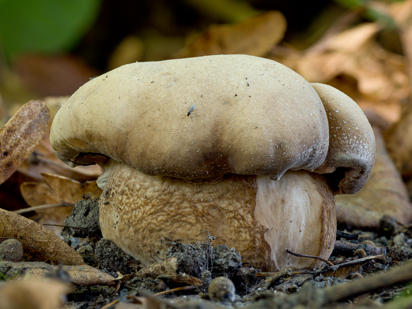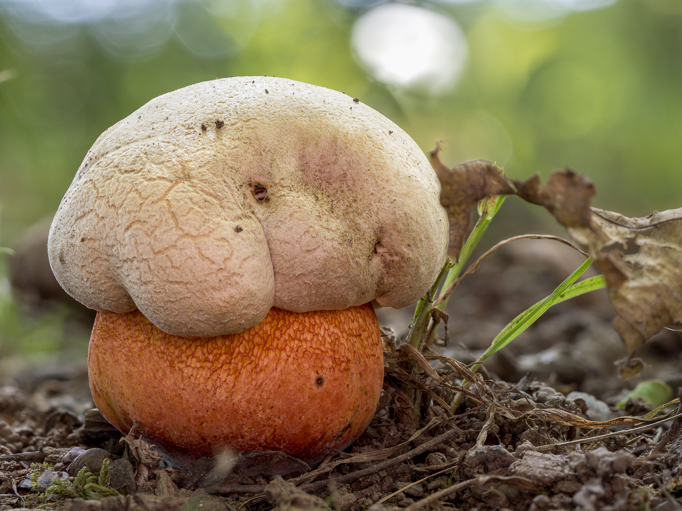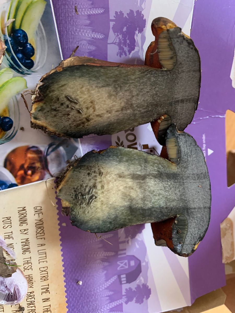 Auf der Nachsuche fand sich dann noch der Baby-Nachwuchs von Rubroboletus legaliae (LeGals Purpurröhrling). In dem Alter noch ohne die typischen Rosatöne, die das ältere Exemplar zeigte. Schnittbild passte auch.