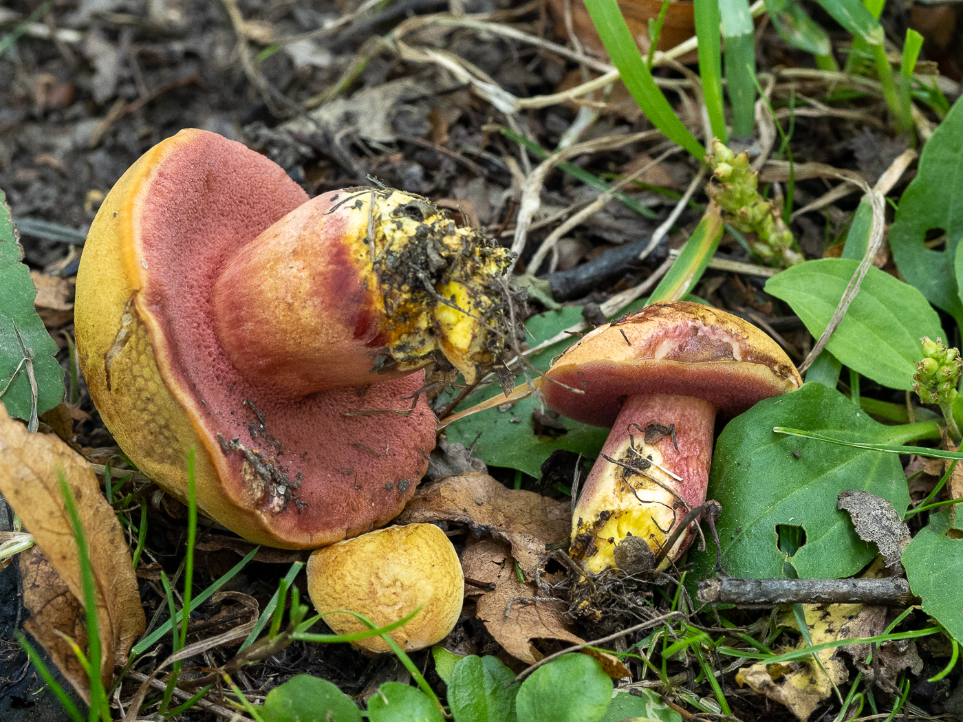 Auf der Nachsuche fand sich dann noch der Baby-Nachwuchs von Rubroboletus legaliae (LeGals Purpurröhrling). In dem Alter noch ohne die typischen Rosatöne, die das ältere Exemplar zeigte. Schnittbild passte auch.