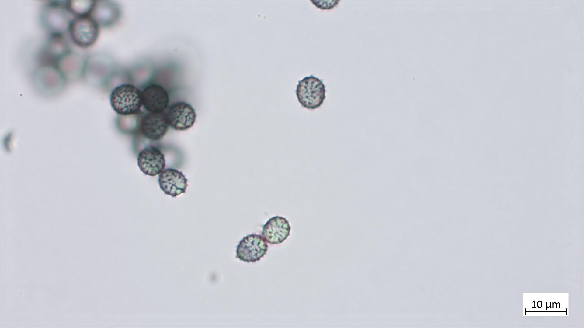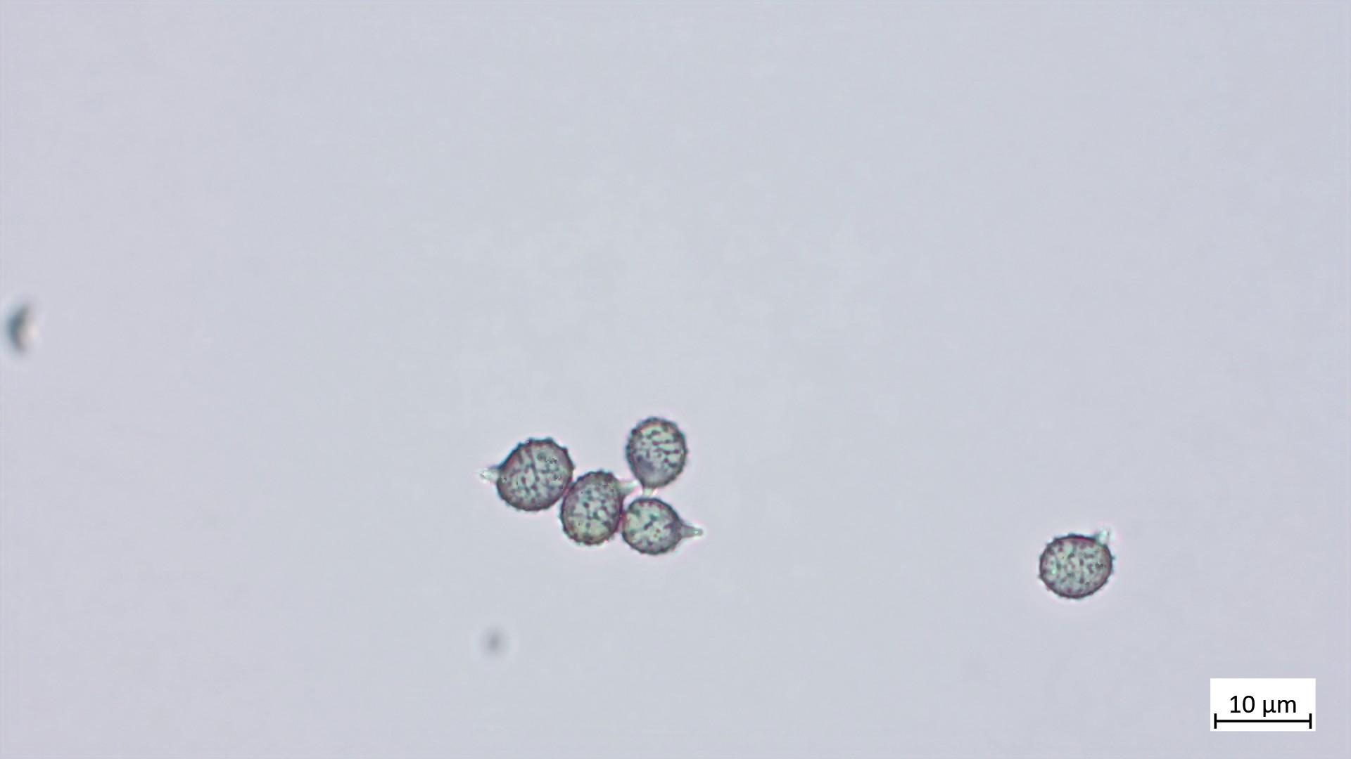 Ich habe 39 Sporen gemessen. Diese lagen bei 7.9 µm (7 - 9.3 µm) x 6.6 µm (5.9 - 7.3 µm), Q = 1.21 (1.08 - 1.40):