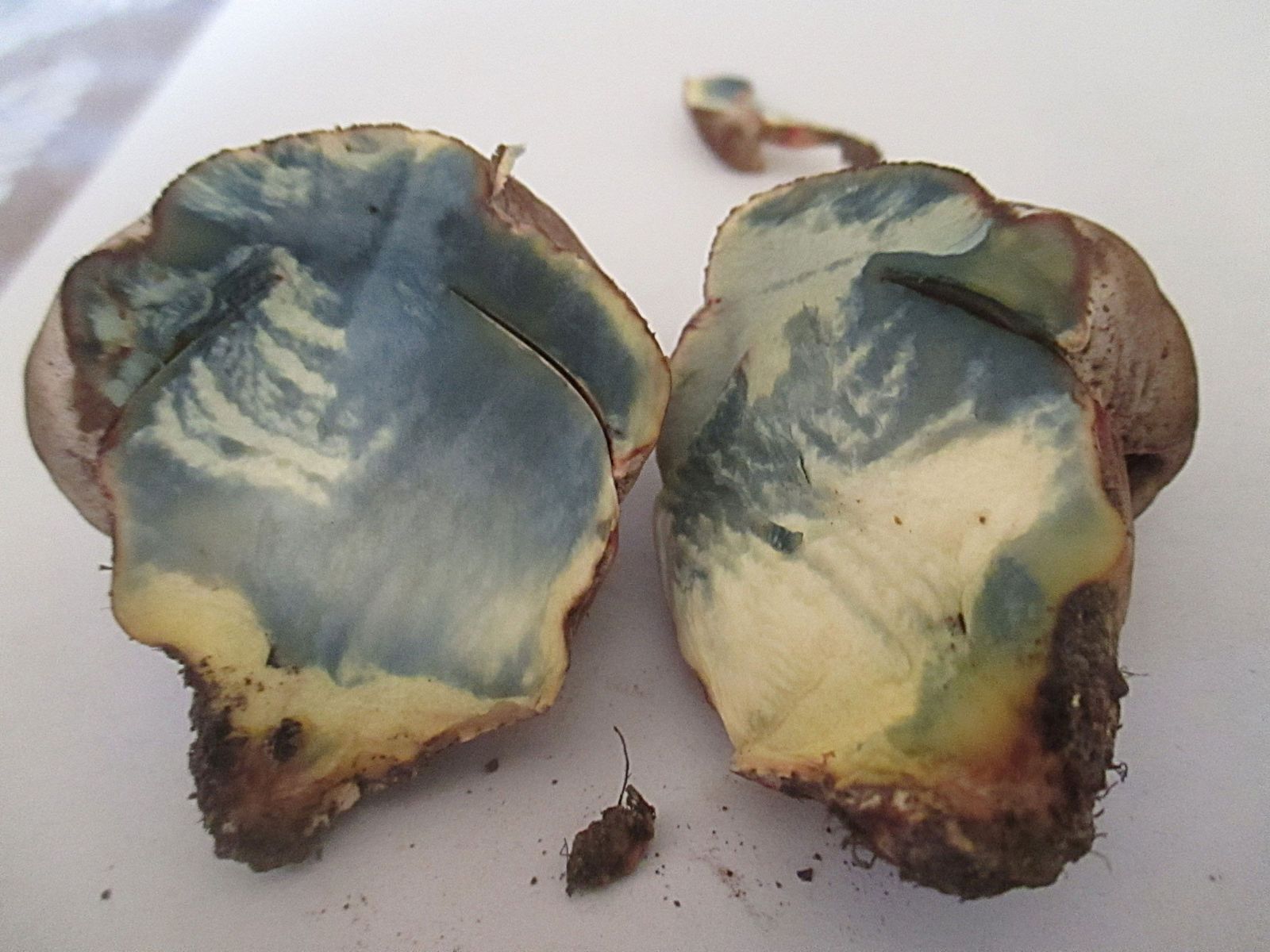 Für R. satanas ist mir die Hutoberfläche viel zu dunkel, fast schon braun und auch eine solch starke Blaufärbung des Fleisches dürfte der nicht haben. Die sind übrigens geruchlos. Einen der anderen seltenen Rotporer kann ich aber auch nicht erkennen. Hier ist noch ein Bild des Fundes nach zwei Stunden.