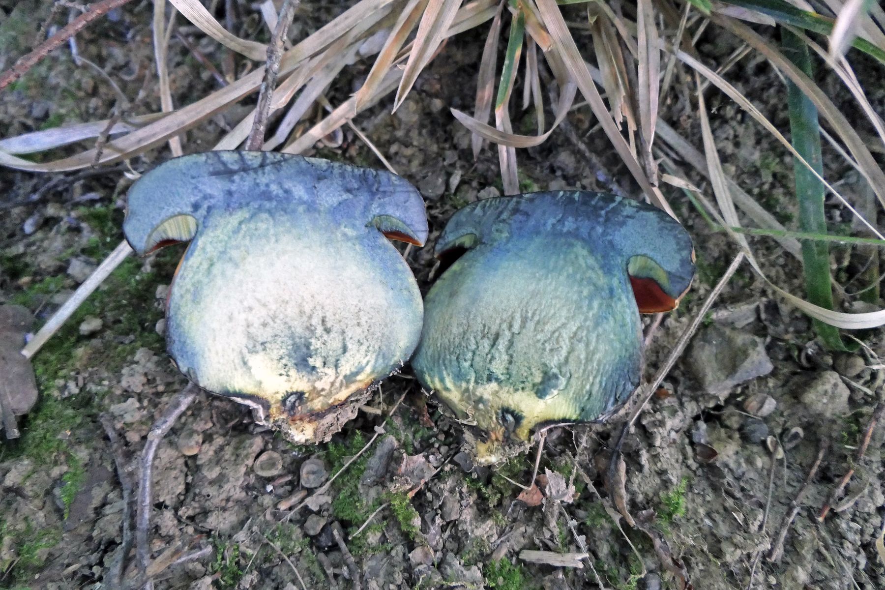 Auch 14 Rubroboletus rubrosanguineus - den weinroten Purpurröhrling gab es nur stark angefressen. Ich habe mich dennoch über einen neuen, mir bisher unbekannten Standort gefreut.
