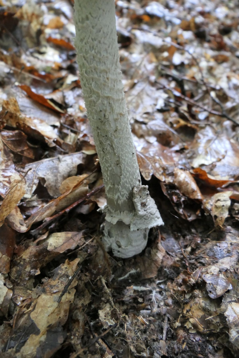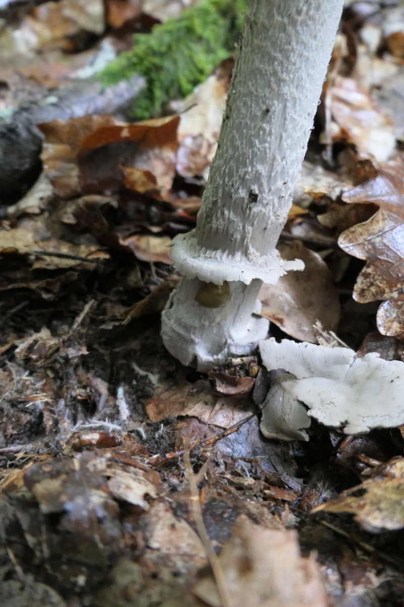 01 Amanita ceciliae - der Riesen-Scheidenstreifling. Wirklich ein stattliches Exemplar mit über 20cm Höhe und den typischen Merkmalen. Grobe dunkle Schollen auf dem Hut, keine richtige Scheide, eher pulverige Velumreste, die in Gürteln um die Stielbasis ziehen.