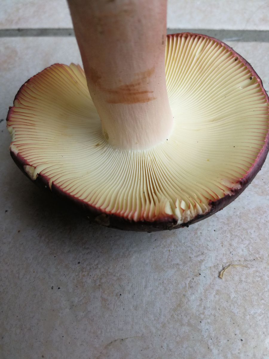 Lamellen: anfangs weiß, nach Transport gelblich werdend, am Hutrand wirken die Schneiden rötlich