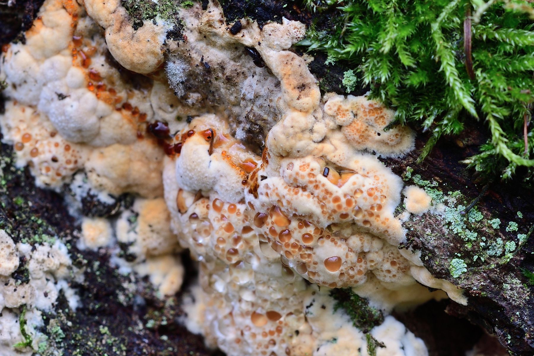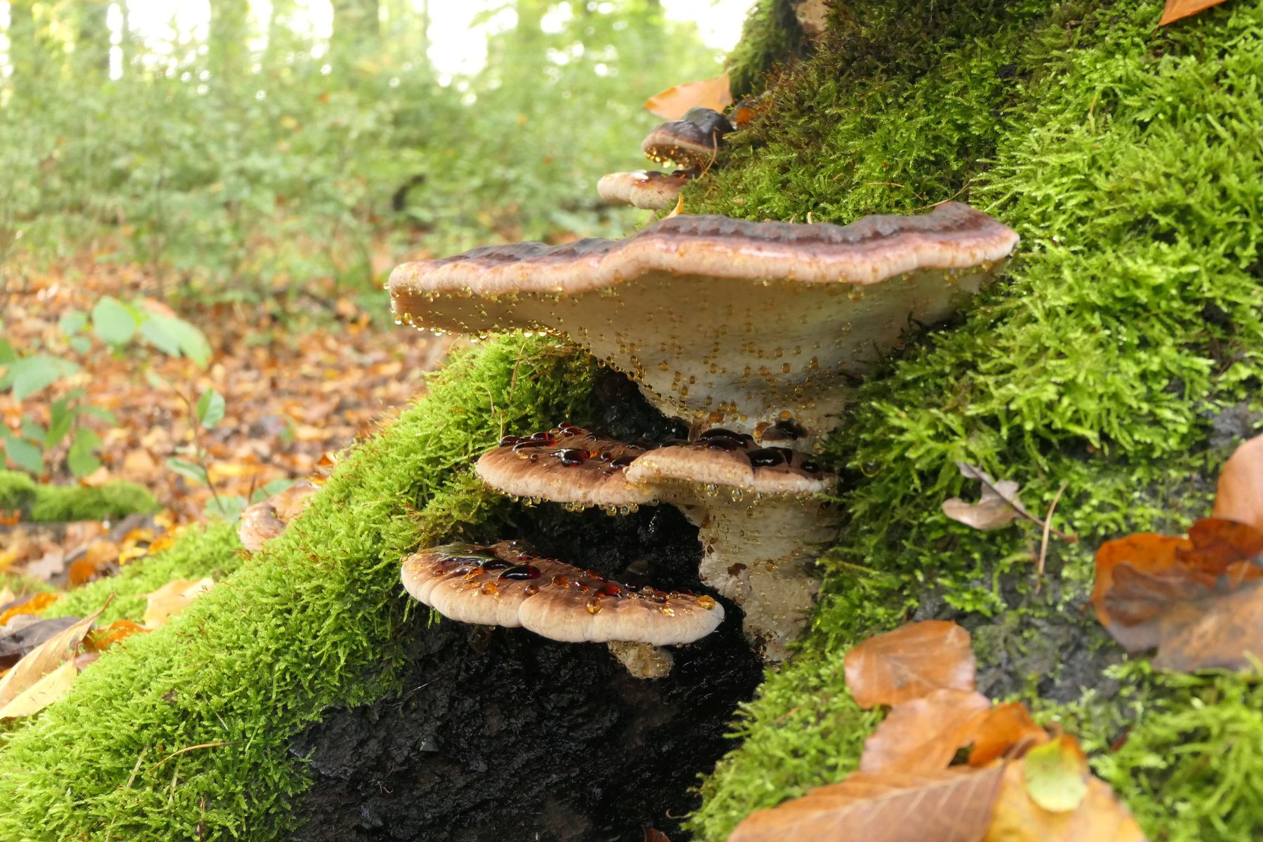 Ein Baumpilz mit herrlichen Tropfen an einer abgestorbenen Eiche in 1,5 m Höhe. (November 2017)