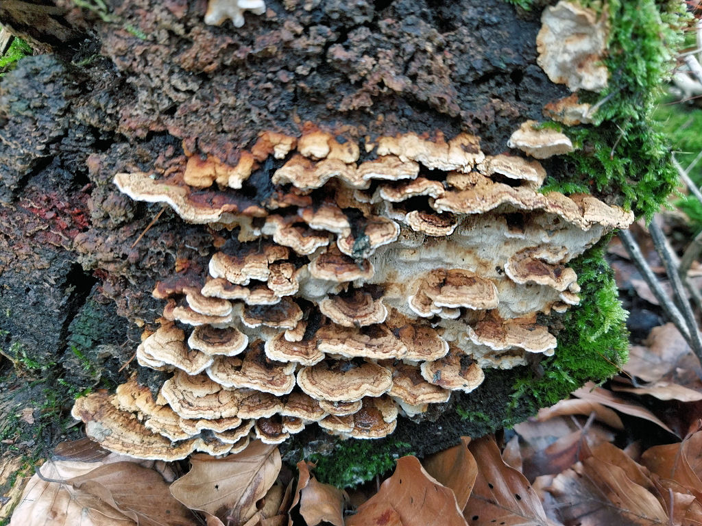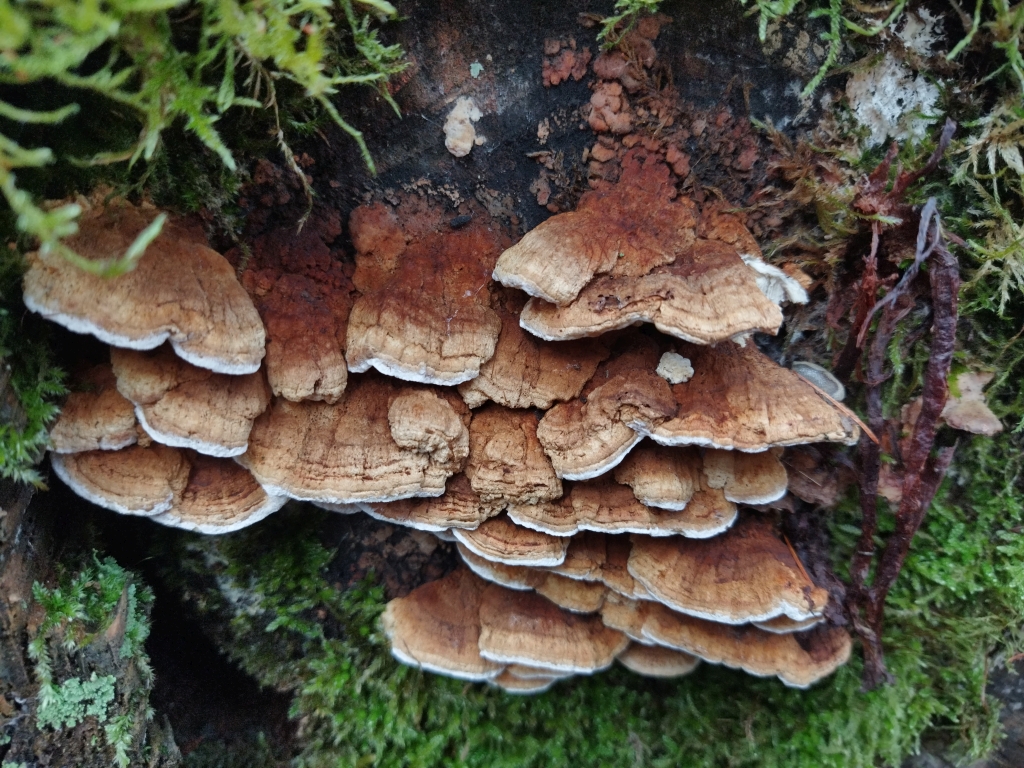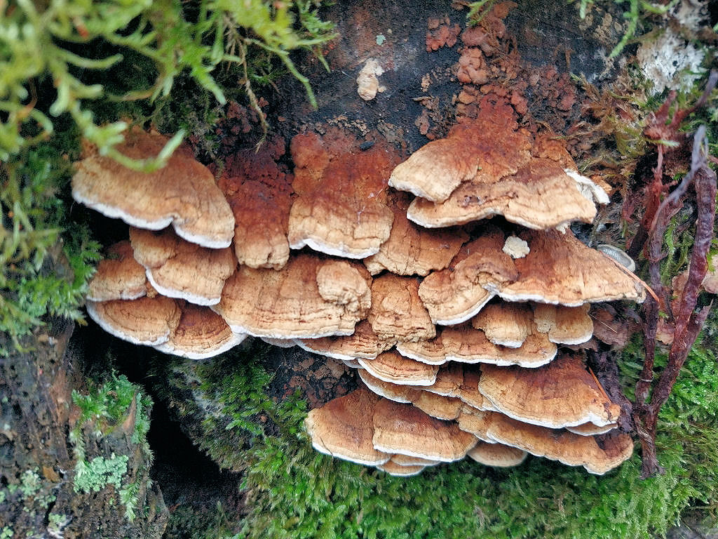 Anfang des Jahres habe ich bei einer Tour folgende Teile ausgemacht, die ich zunächst in die Antrodia-Ecke stellen wollte. Nach vergeblicher Mühe habe ich die erstmal beiseite gelegt, bis ich kürzlich Trametes cervina unter die Augen bekam und ich dachte, dass der meinem Pilz doch nahe kommt.