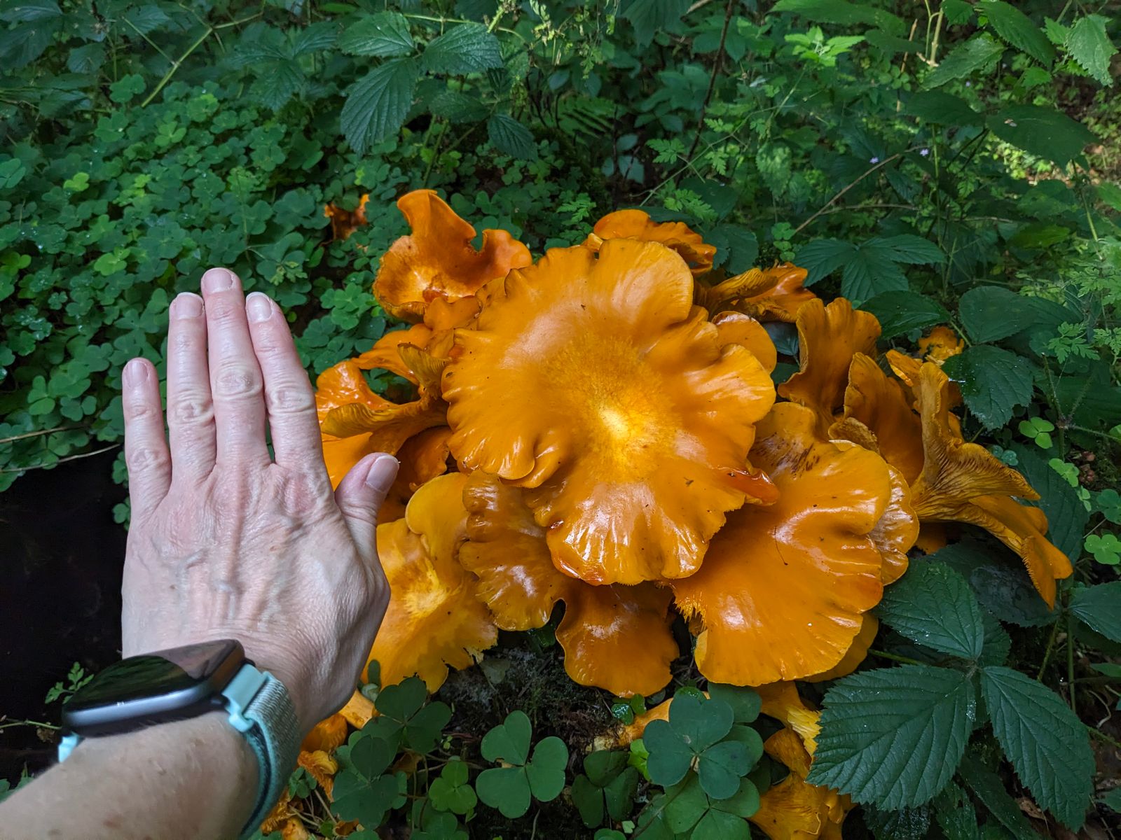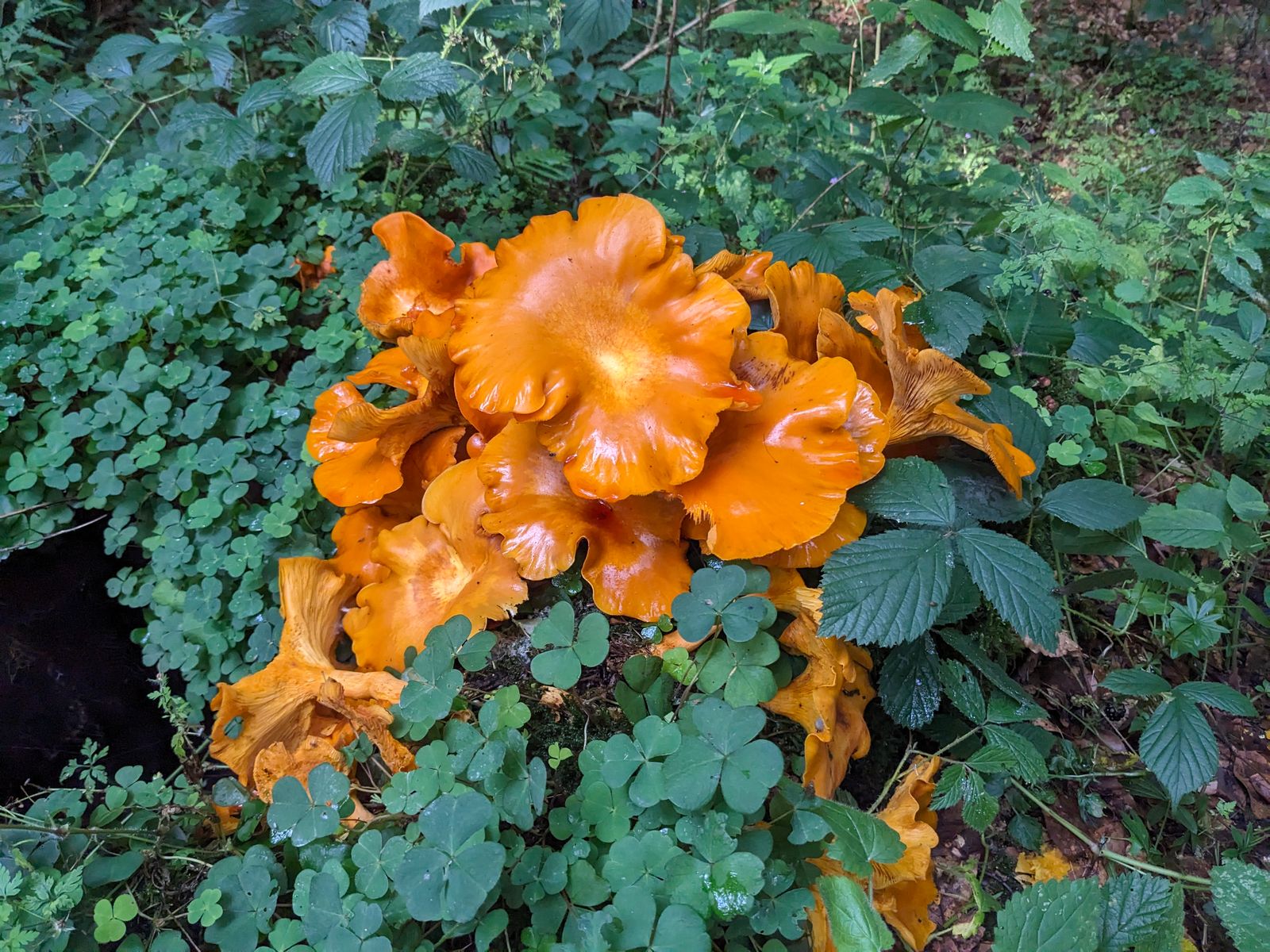 Da wir mit Babies und Hunden unterwegs waren, reichte es nur für Schnappschüsse von oben, aber ein wenig erkennt man. Ich vermute Omphalotus illudens, kann das sein? Der wäre ja sehr selten (Nordhessen), aber Alternativen sehe ich gerade nicht so recht... Was meint ihr?