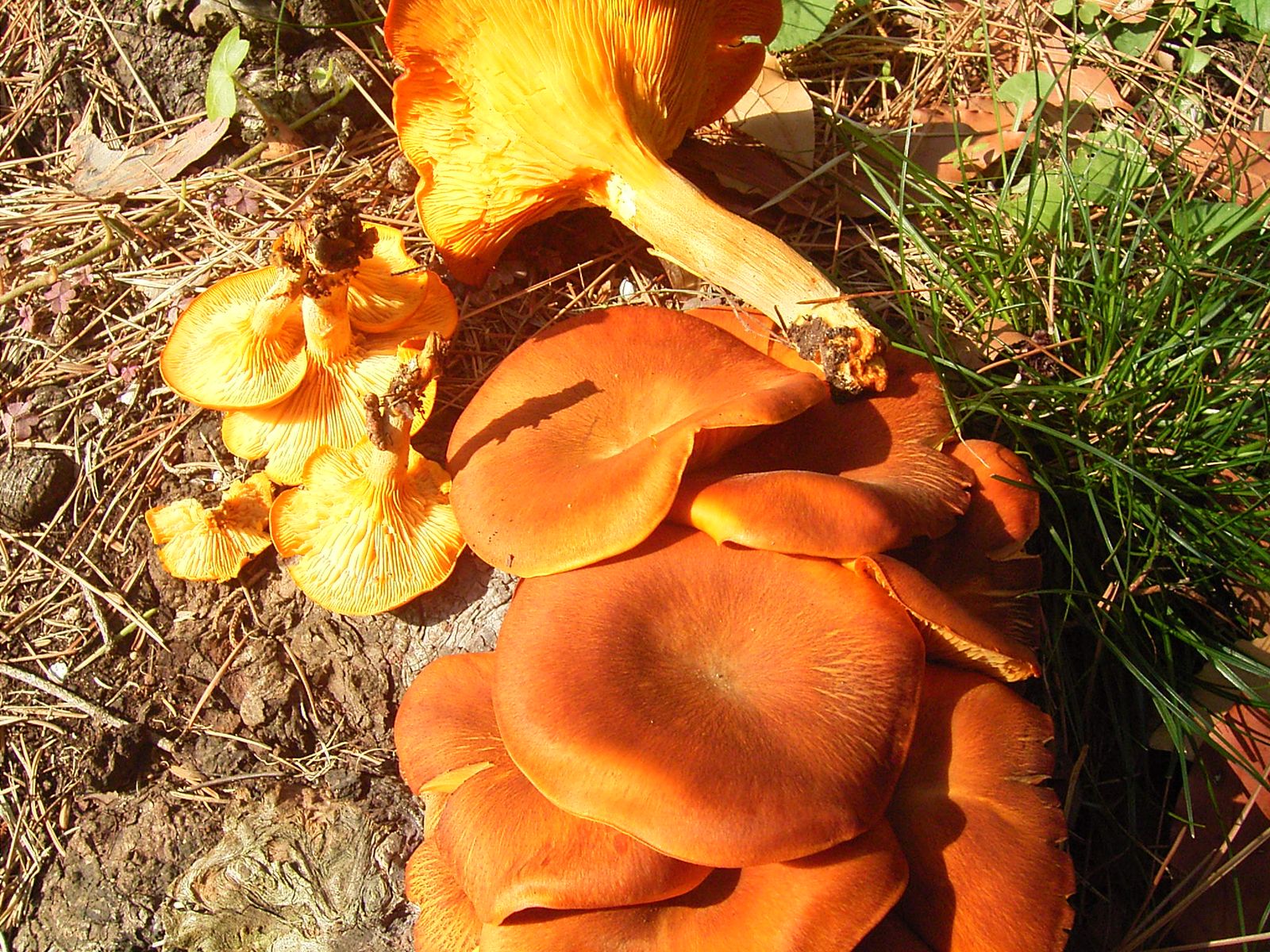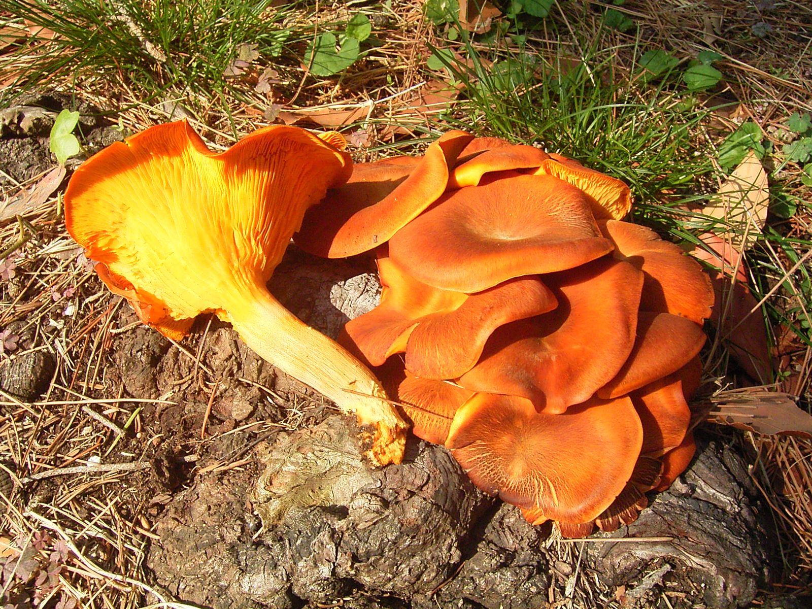 gestern beim Spaziergang (ohne pilzige Ambitionen) sah ich diese Pilze am Wegrand. Sie waren riesig und extrem knallig orange. Sie wuchsen auf einem Baumstumpf, vermutlich Buche.