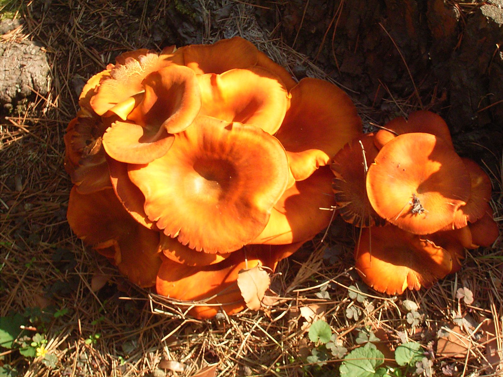 Da wir mit Babies und Hunden unterwegs waren, reichte es nur für Schnappschüsse von oben, aber ein wenig erkennt man. Ich vermute Omphalotus illudens, kann das sein? Der wäre ja sehr selten (Nordhessen), aber Alternativen sehe ich gerade nicht so recht... Was meint ihr?