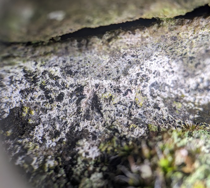 (2) Makroskopische Gestalt (Graue Flecken auf Stein und in der Fuge)