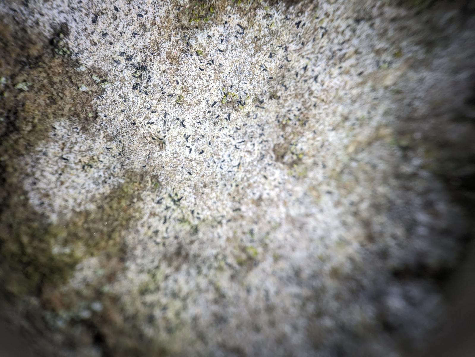 Fundort ist eine ältere Bahnbrücke über einen Feldweg (Nordseite) aus Kalksandstein(?) am Standtrand von Hannover. Dort auf den Steinen und auf den Mörtelfugen findet sich nicht selten eine Krustenflechte mit indistinkt auslaufendem weißen Thallus und schwarzen lirelliformen Ap. Die Sporen sind keulenförmig, 3-septiert 14-16 µm lang und 4.5-5.0 µm breit. Die Paraphysen zum teil deutlich verzweigt. Das Hymenium im oberen Teil J+ blau, unten orange. Exipulum scheint unter dem Hymenium geschlossen zu sein. Photobiont ist Trentepohlia sp. Nicht abgebildet ist C-, K-, P- (jeweils nur an sehr kleinen Stücken getestet).