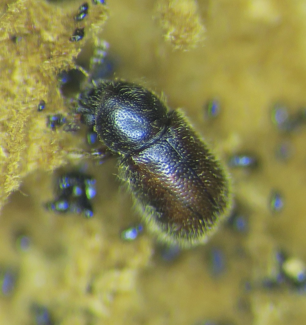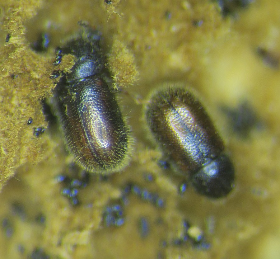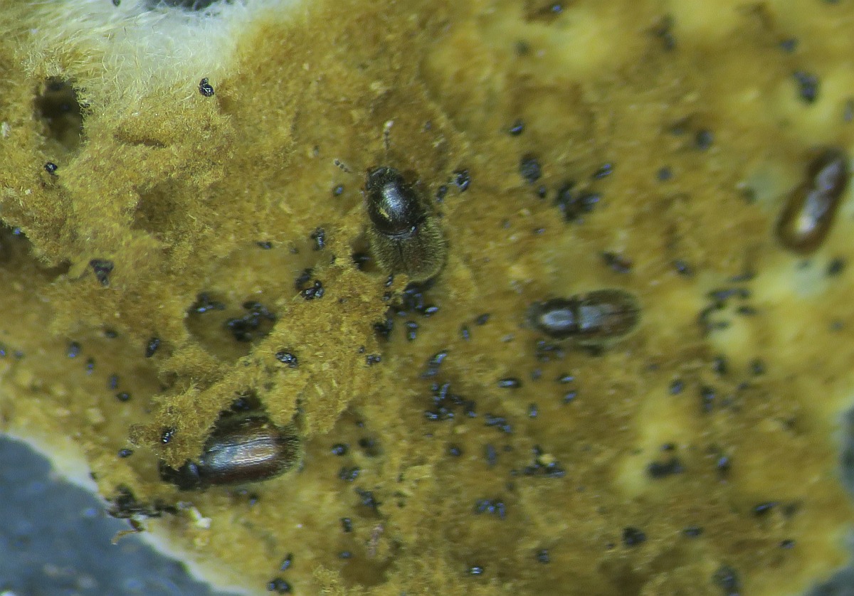 I was cleaning my mycology desk and preparing for a fresh start for the next season, and there were some old specimens of bracket fungi (Inonotus and Ganoderma, etc ). The hard specimens were soft and semi-pulverised by some small (2mm) beetle consuming them. They have not seen water for four months, but they hatched within the last two-three months. There were a lot. Soft moving, afraid of light with shiny brown exoskeleton and quite attractive antlers, made of three pale brown brushes. I was wondering if you had met these and what beetles they are. A quick search resulted in this interesting article: