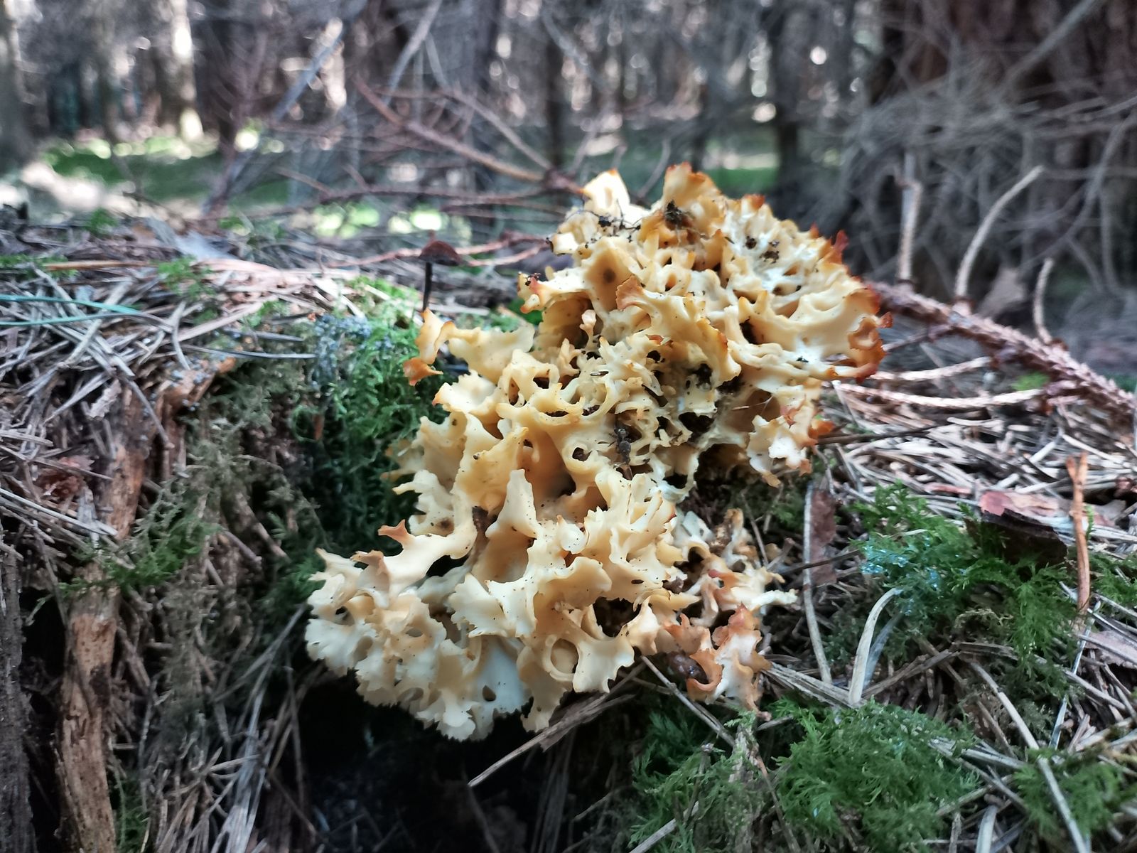 An einem alten Kiefern-Stumpf zeigen sich die Überreste einer Krausen Glucke. Gezielte Suche nach Mehr leider ohne Ergebnis.