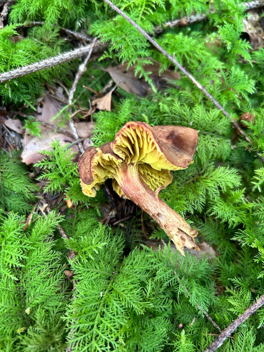 Nicht weit davon entfernt zeigen sich ein paar kleine Fruchtkörper vom Pfifferling. Die Trockenheit macht ihnen zu schaffen. Im Frühsommer, als es noch häufiger geregnet hat, waren an der Stelle deutlich stämmigere Fruchtkörper zu finden.