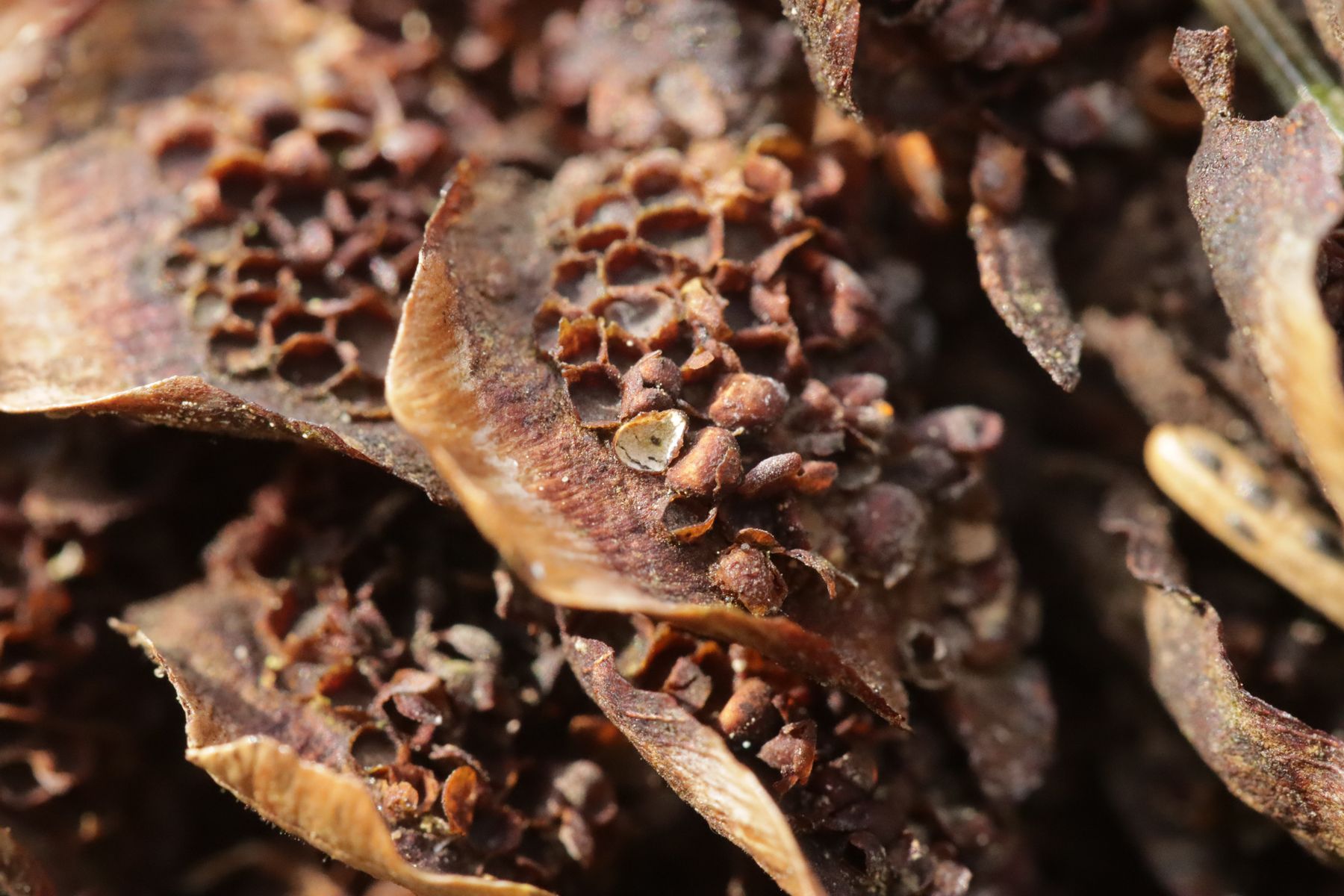 Hallo Kauz, ich hielte das für Exkremente einer Insektenlarve. Drumherum sind auch einige feine Fäden zu sehen oder täusche ich mich?