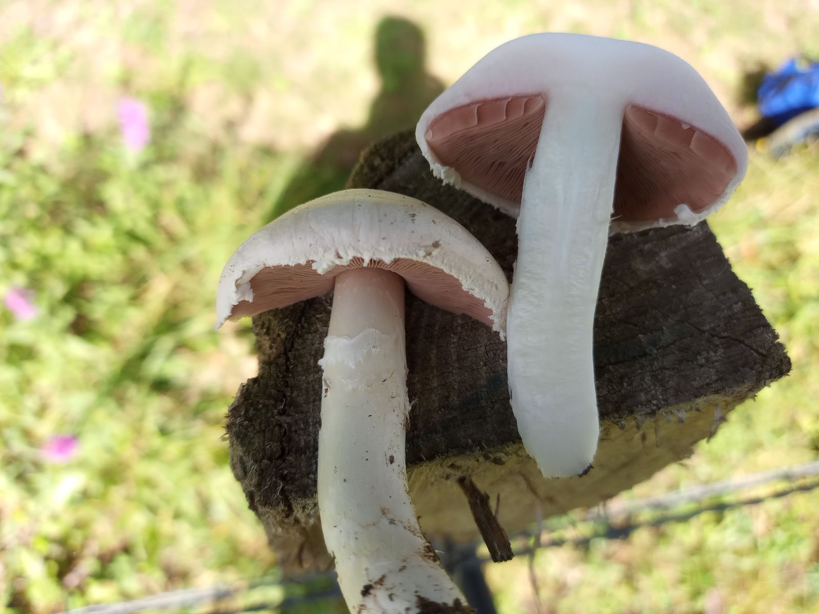 Später, auf einer Kuhweide, ein Nest mit Wiesenchampignons (Agaricus campestris). Die Bestimmung von Champignons finde ich schwierig, zumal ohne Literatur im Urlaub. Trotzdem wage ich hier die Art zu nennen. Fundort, Geruch (nix Anis o.ä., sondern wie Zucht-Champignons), das Fehlen von Gilben, der flüchtige Ring, die braunen Schüppchen der älteren Exemplare scheinen mir eindeutig zu sein.
