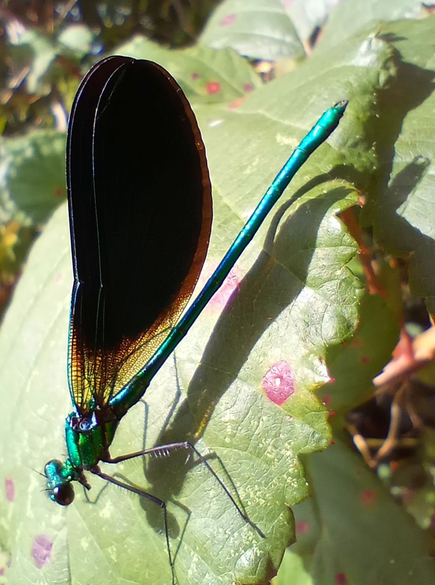 Über die Möglichkeit zu diesem Bild habe ich mich besonders gefreut. Die fliegen immer so schnell weg. Blauflügel-Prachtlibelle (Caloperyx Virgo). Die schönen blauen Flügel wollte sie im Sitzen nicht ausbreiten.