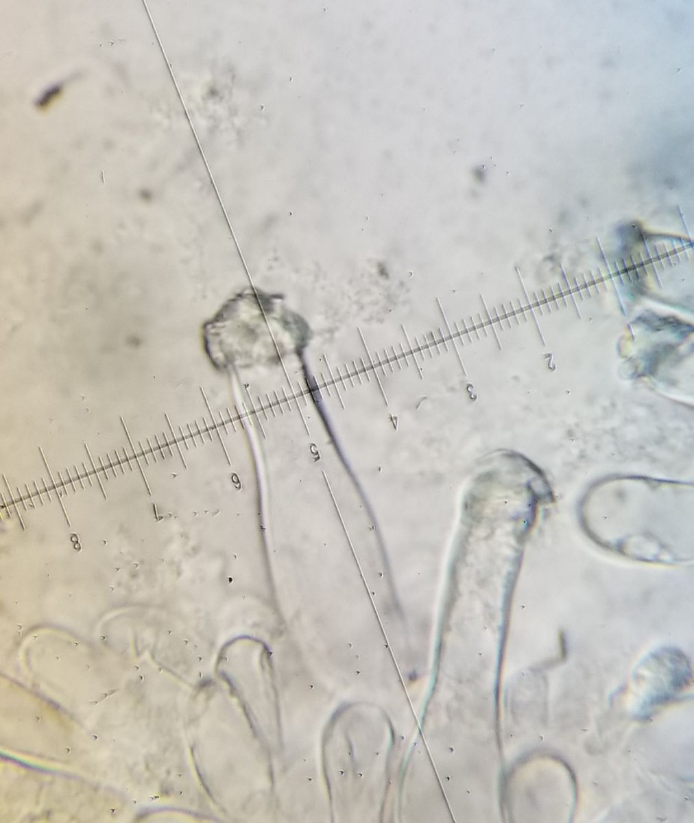 Zystiden: dickwandige, bauchige Hymenialzystiden mit Kristallschopf gefunden