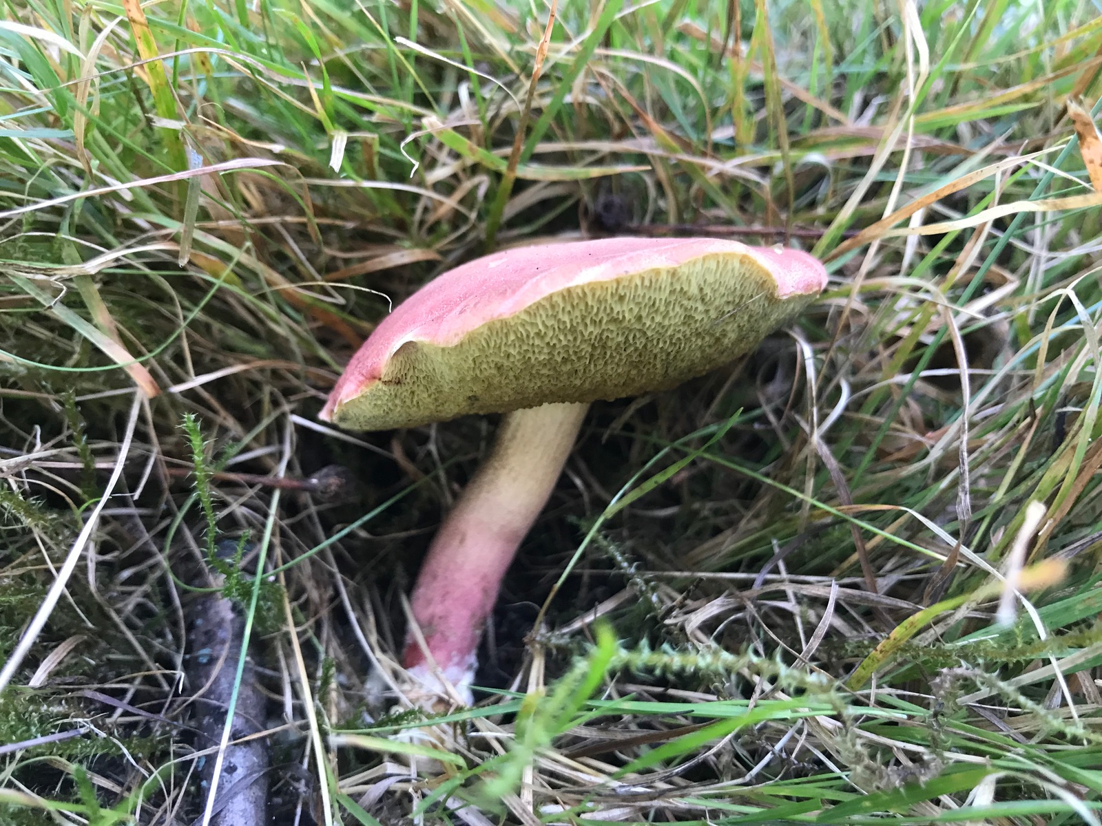 20. Und dann gab es tatsächlich doch noch ein paar kleine Pilzchen: ein einziger rosenroter Schmierling. Der parasitiert auf Kuhröhrling. Von denen war aber nix zu sehen!