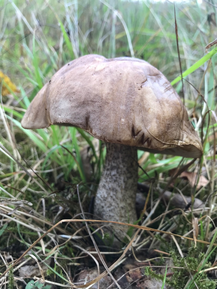 20. Und dann gab es tatsächlich doch noch ein paar kleine Pilzchen: ein einziger rosenroter Schmierling. Der parasitiert auf Kuhröhrling. Von denen war aber nix zu sehen!