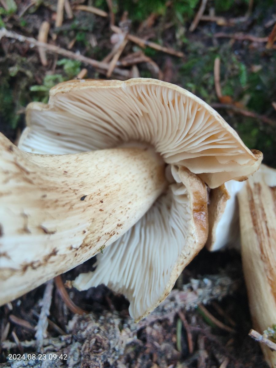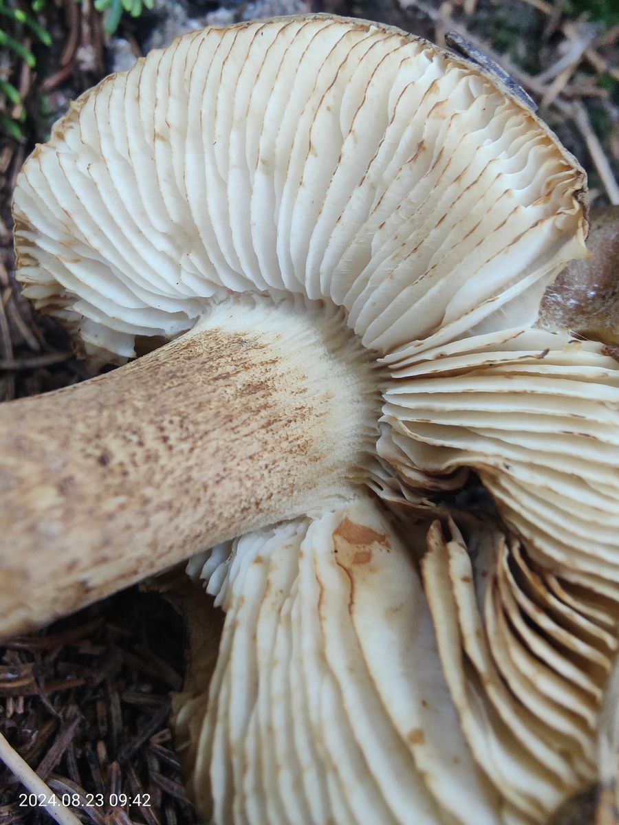 das mit dem Bräunen der Lamellenschneiden; Dies habe ich unteranderem im Christensen gelesen -> "...... sometimes with a brownish tinge towards the eroded edges....."