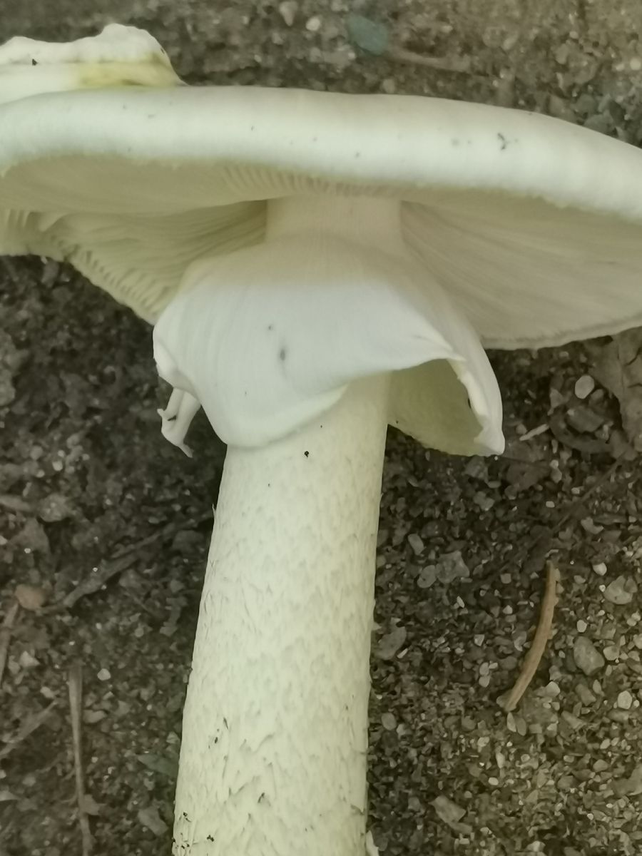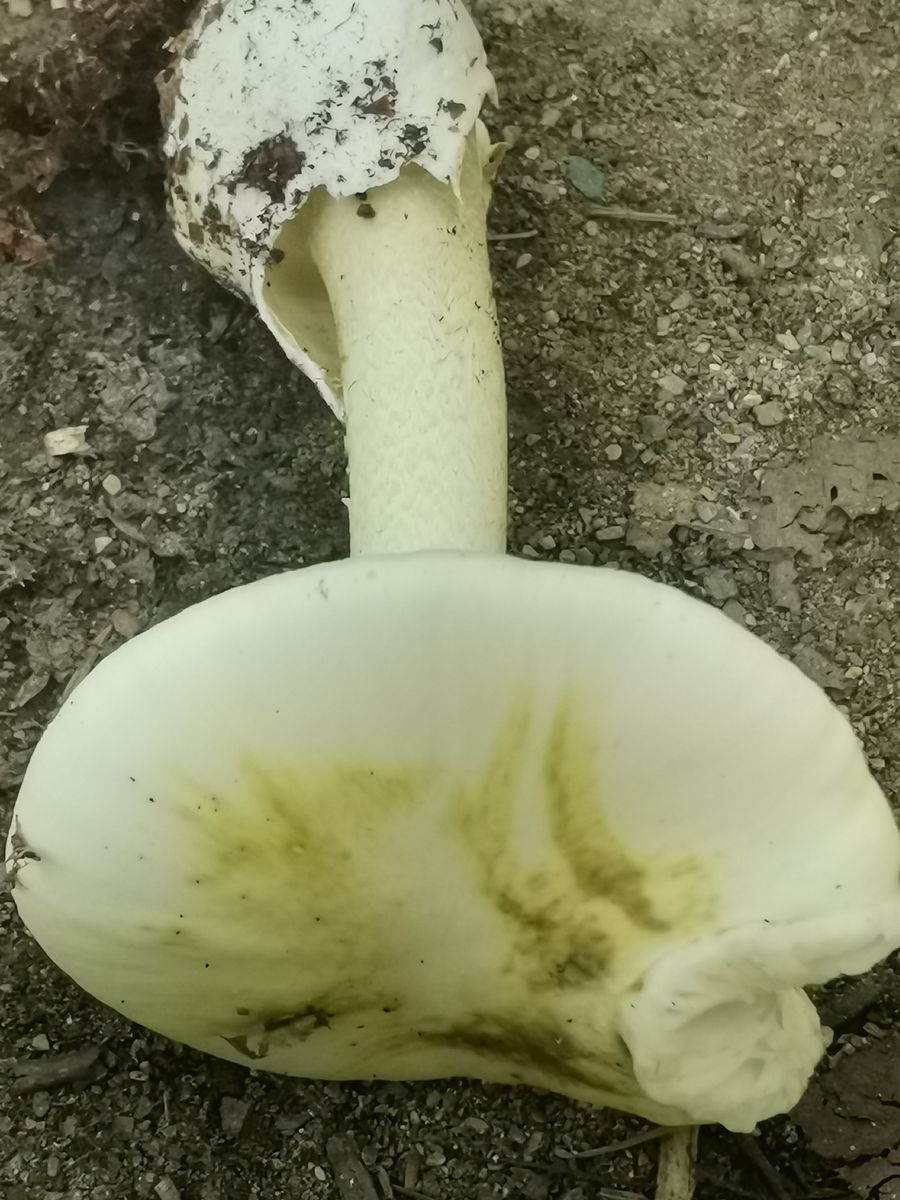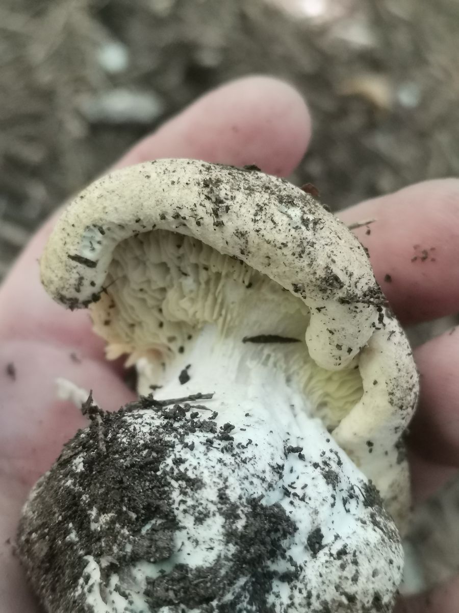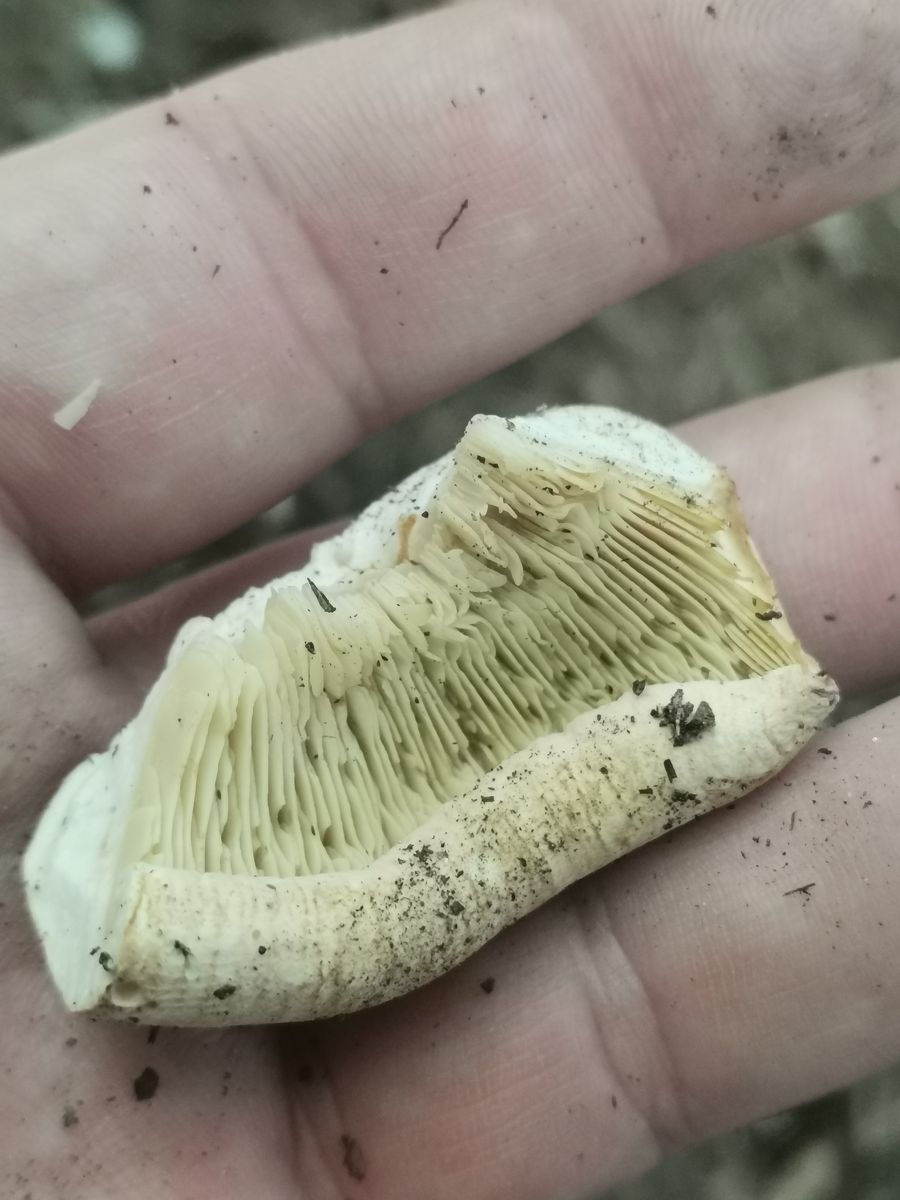 beige-fahler Hut, gelbe Lamellen, weißer Stiel. Der Name signalisiert die Abgrenzung zum Weißen Krempenritterling, der reinweiß ist.