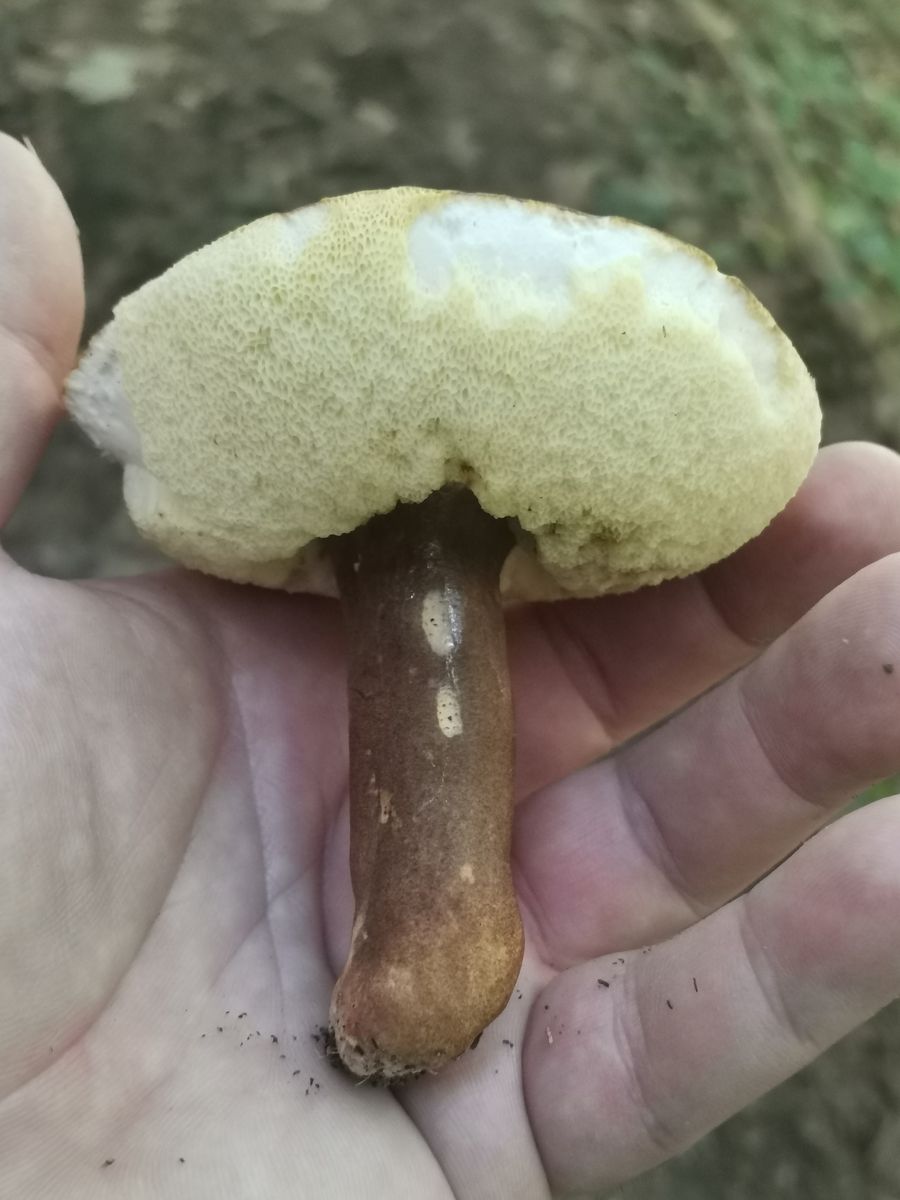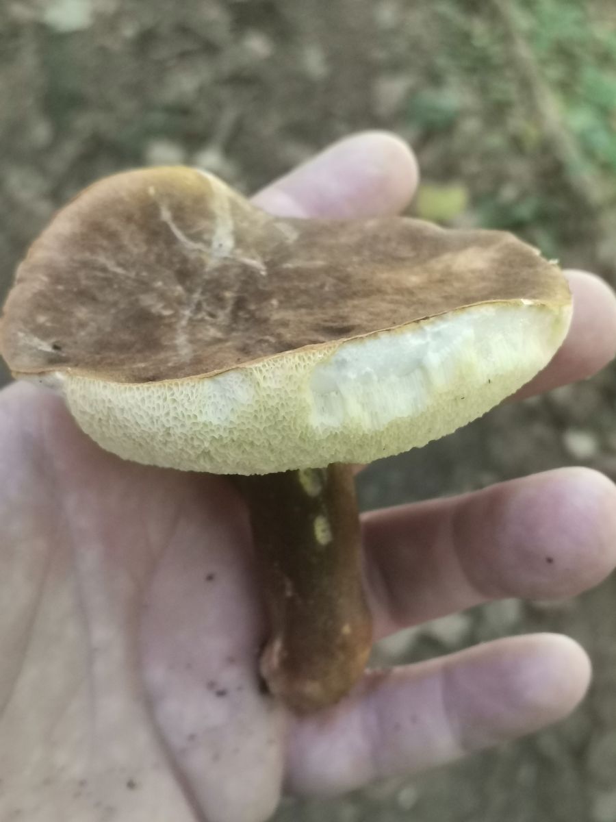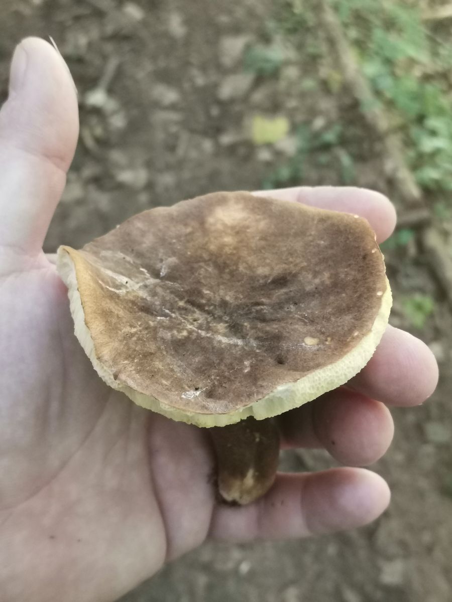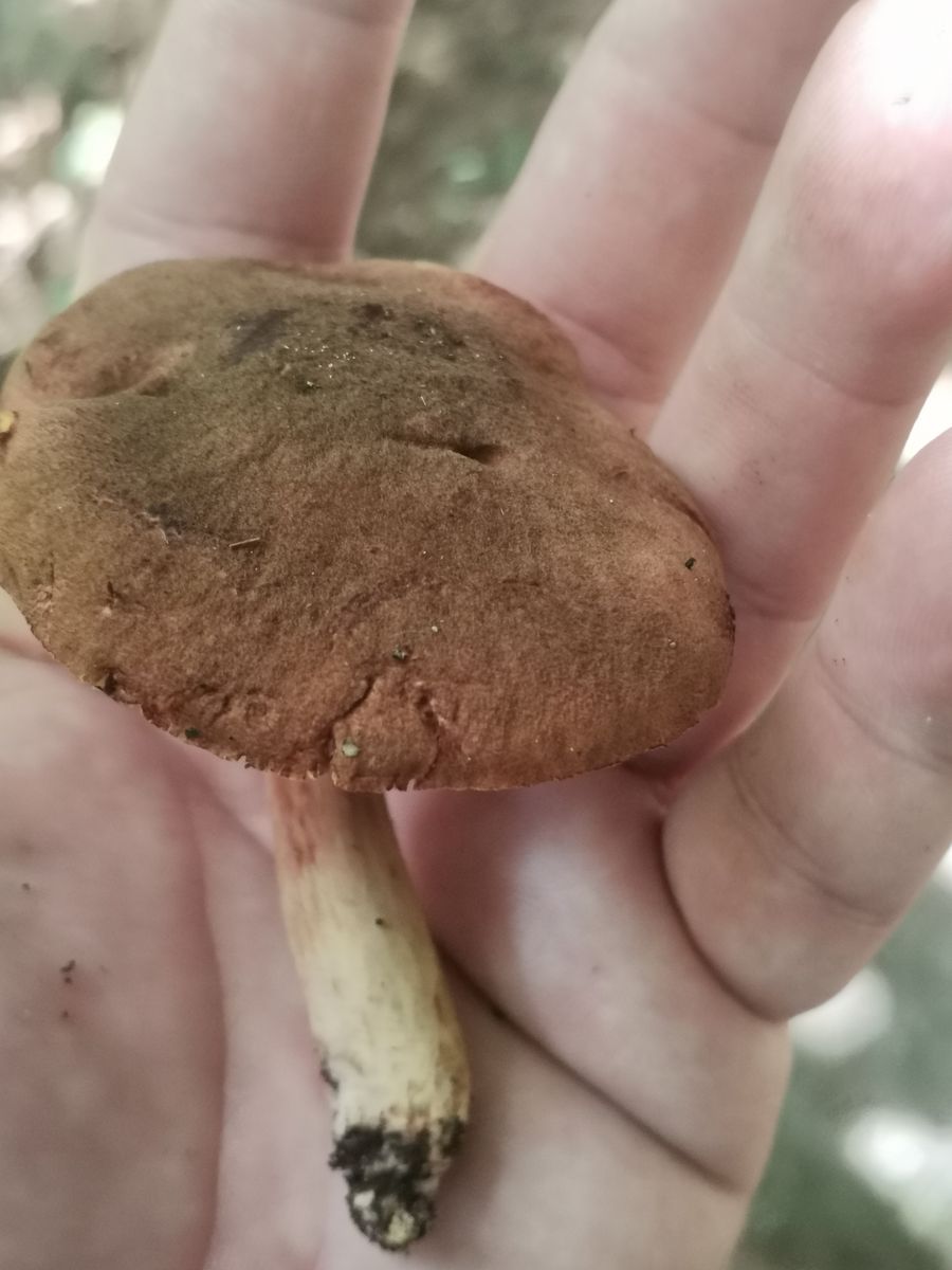 Das ist kein Anhängselröhrling wegen der gedellten Hutoberfläche und dem fehlenden Stielnetz samt fehlender Blauverfârbung.