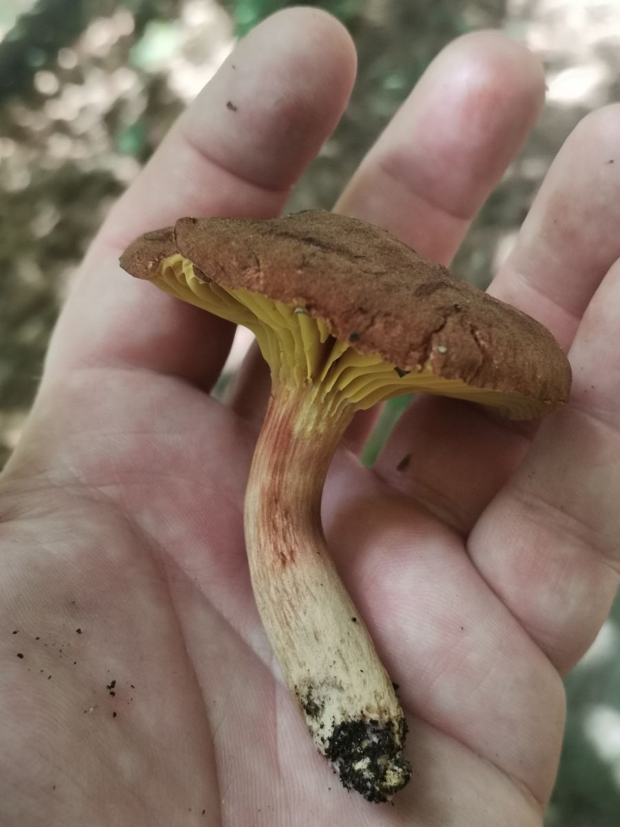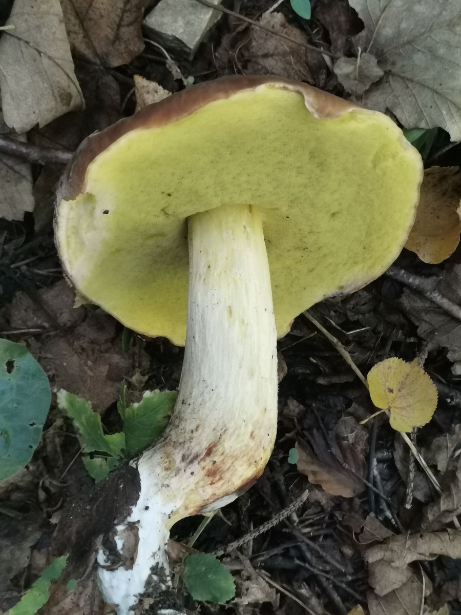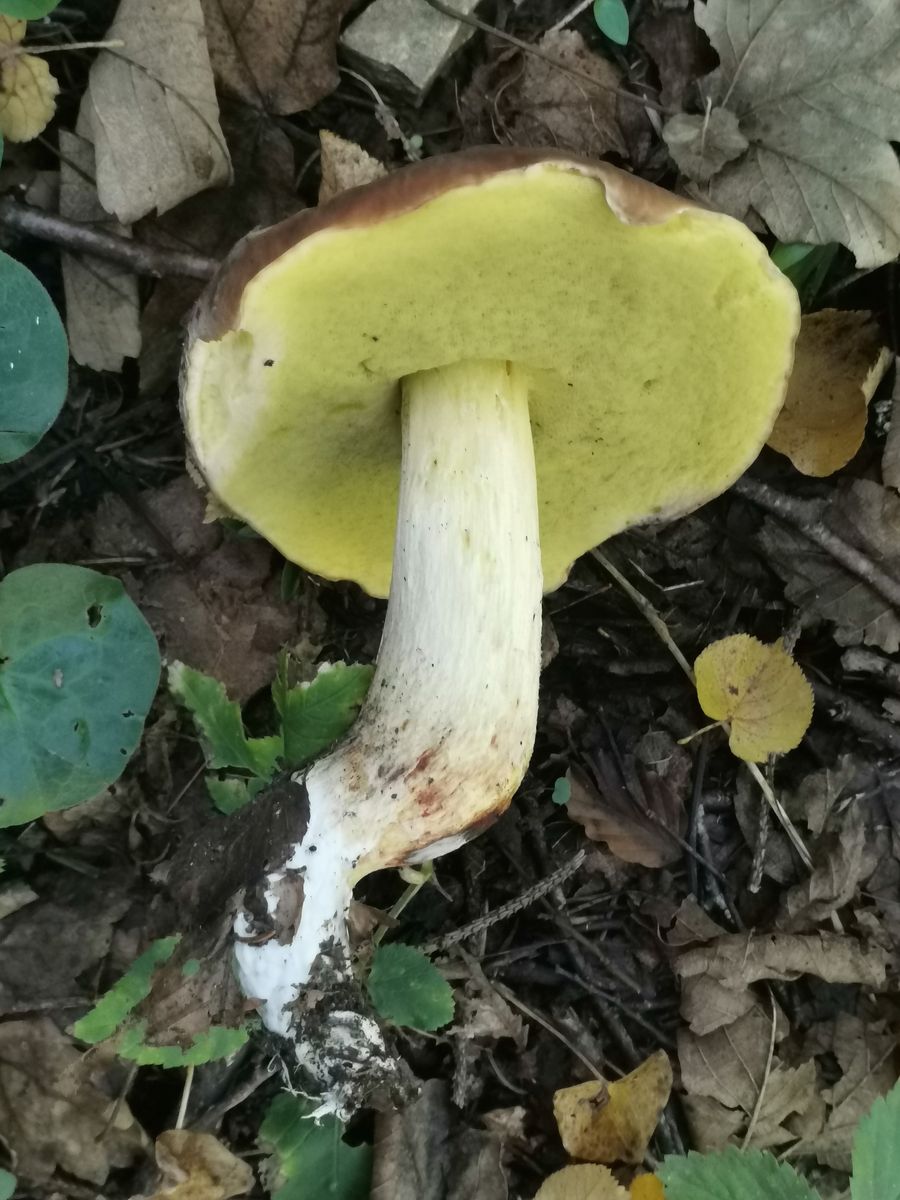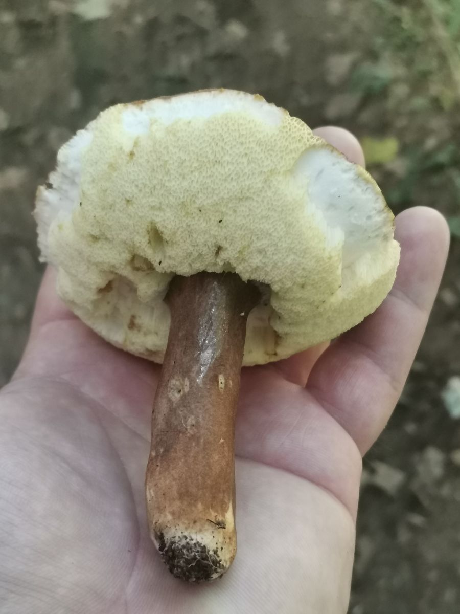 Das ist kein Anhängselröhrling wegen der gedellten Hutoberfläche und dem fehlenden Stielnetz samt fehlender Blauverfârbung.