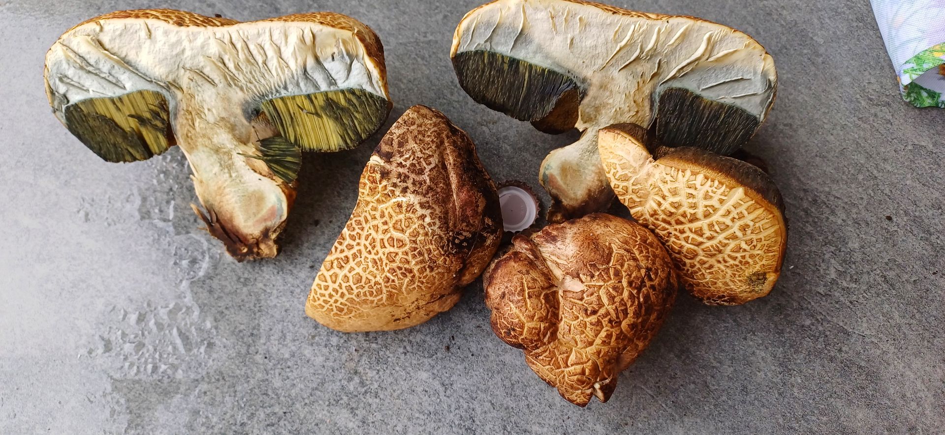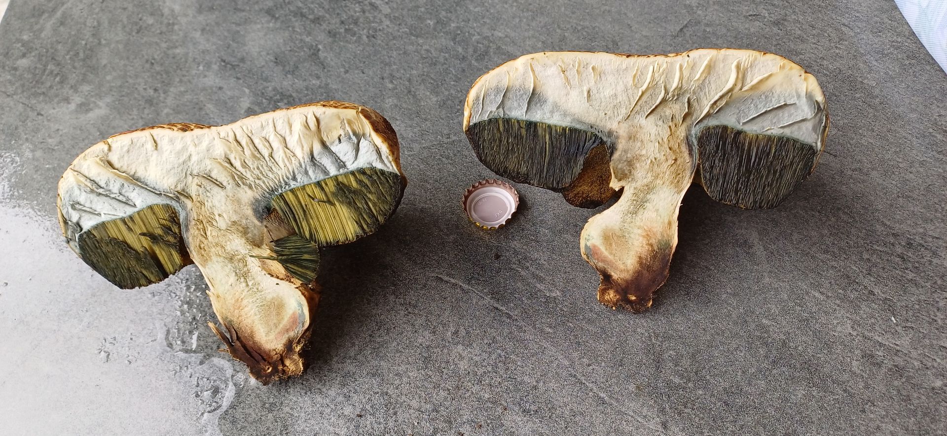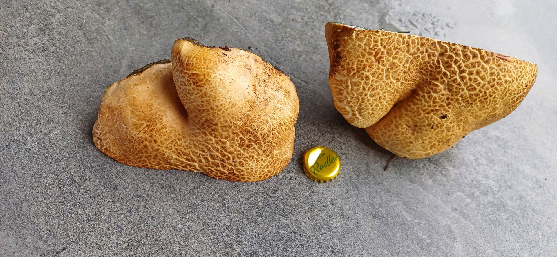 Eben fand ich in Aachen neben der Eupener Str. ca.#283 unter großen unbeachteten Laubbäumen – es war im Platzregen – zwischen Fahrradweg und Fahrbahn im Grünstreifen vier Porlinge mit Kappenbreite bis max.15cm, beim Anschnitt nicht durchgehend aber sehr deutlich mittelblau anlaufend – die Bilder entstanden ca. 5 min später, als die Bläuung schon zurückgegengen war und dunkelte. Der Geruch ist angenehm, leicht würzig, der Geschmack angenehm und nicht bitter.