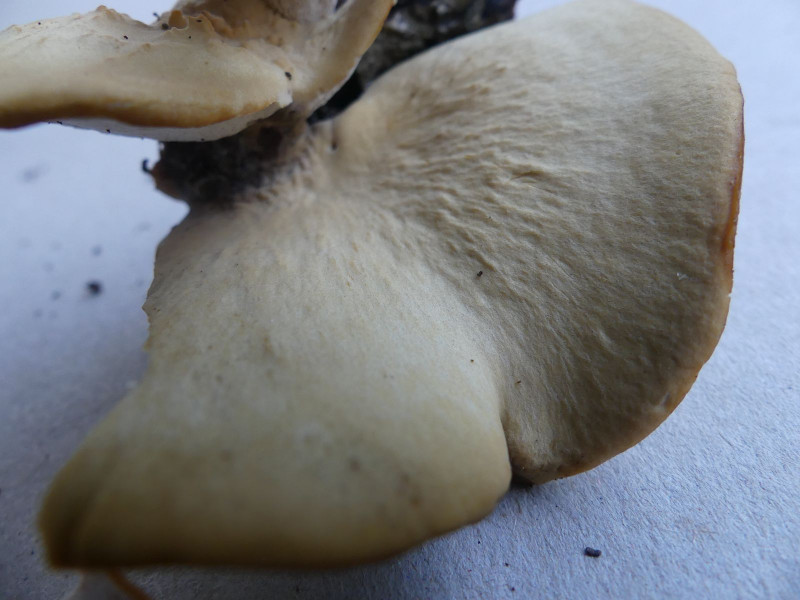 heute war ich im Eichen-Buchen-Kiefern-Mischwald unterwegs. An einem Buchenstumpf konnte ich diesen augenscheinlich noch recht jungen Porling finden, den ich nicht identifizieren kann. Markant ist die etwas runzelig-zerfurchte Oberfläche und der angenehm bis schwach würzige Geruch, den ich irgendwo zwischen frisch angeschnittenen Steinpilz mit einer kleinen Prise Krause Glucke beschreiben würde. Breiteste Stelle ca. 8 cm, Dicke der Fruchtkörper knapp 1 cm.