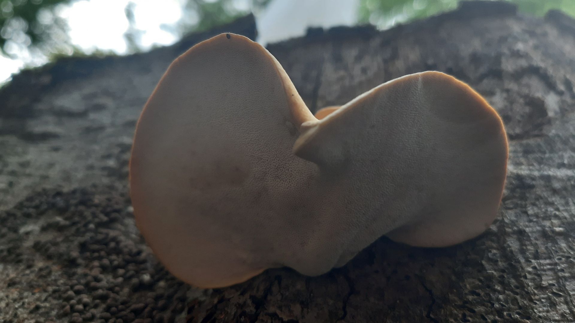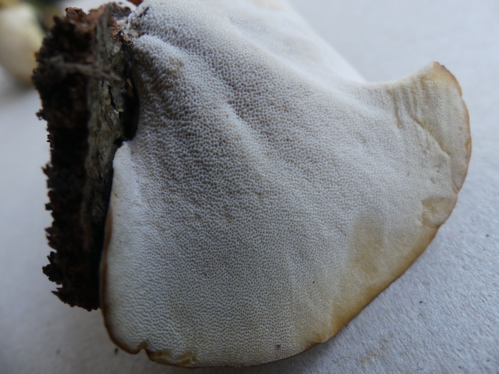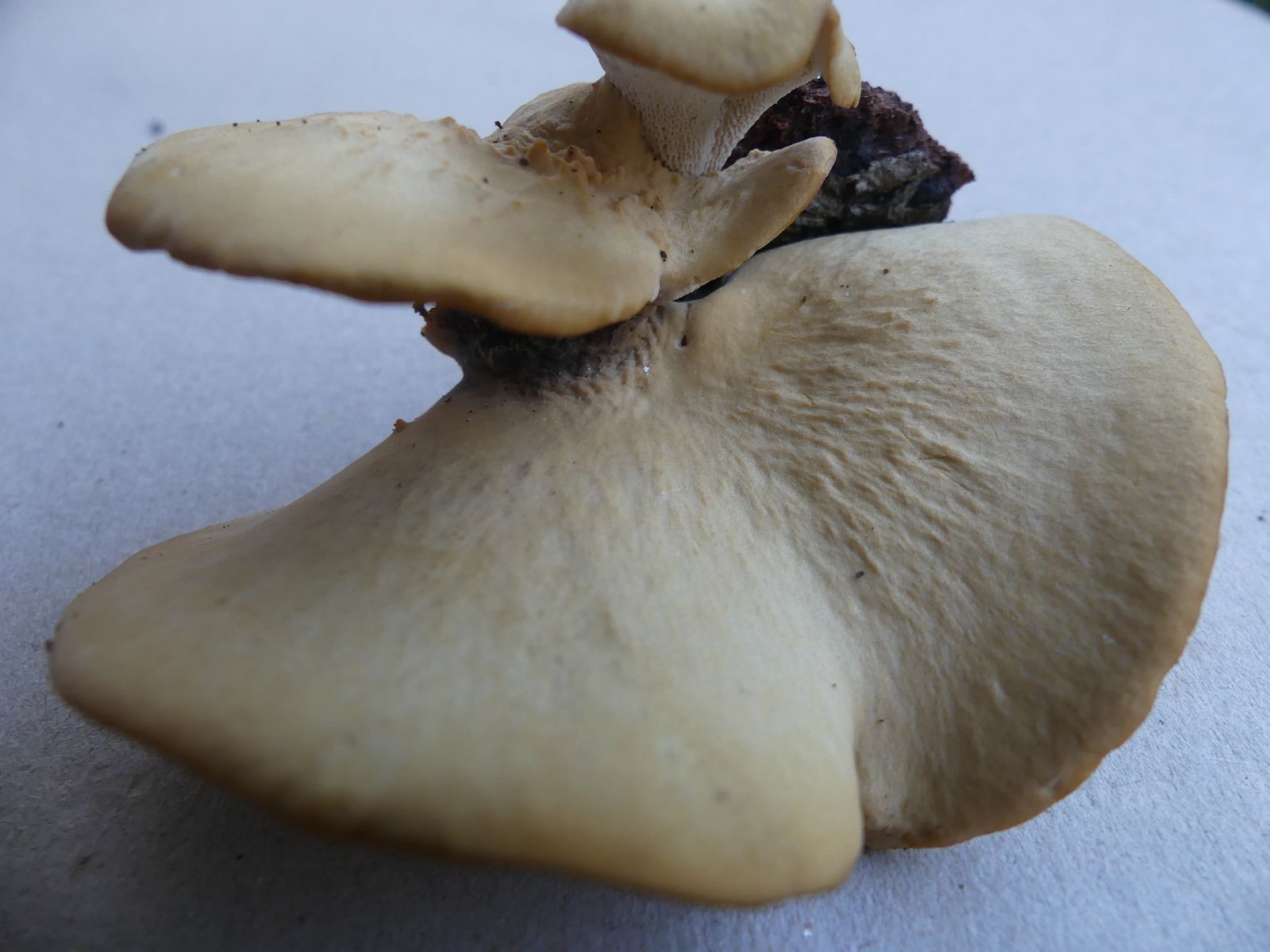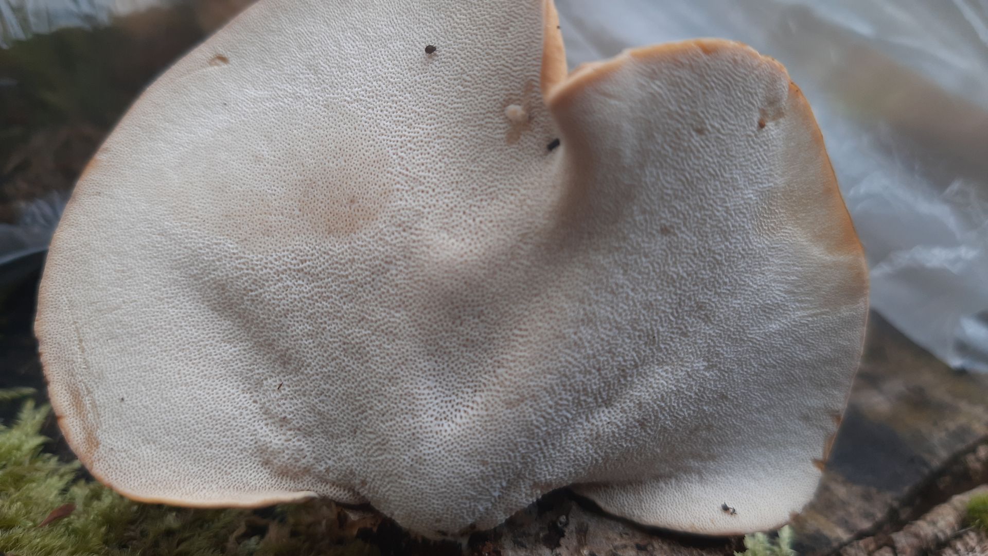 heute war ich im Eichen-Buchen-Kiefern-Mischwald unterwegs. An einem Buchenstumpf konnte ich diesen augenscheinlich noch recht jungen Porling finden, den ich nicht identifizieren kann. Markant ist die etwas runzelig-zerfurchte Oberfläche und der angenehm bis schwach würzige Geruch, den ich irgendwo zwischen frisch angeschnittenen Steinpilz mit einer kleinen Prise Krause Glucke beschreiben würde. Breiteste Stelle ca. 8 cm, Dicke der Fruchtkörper knapp 1 cm.