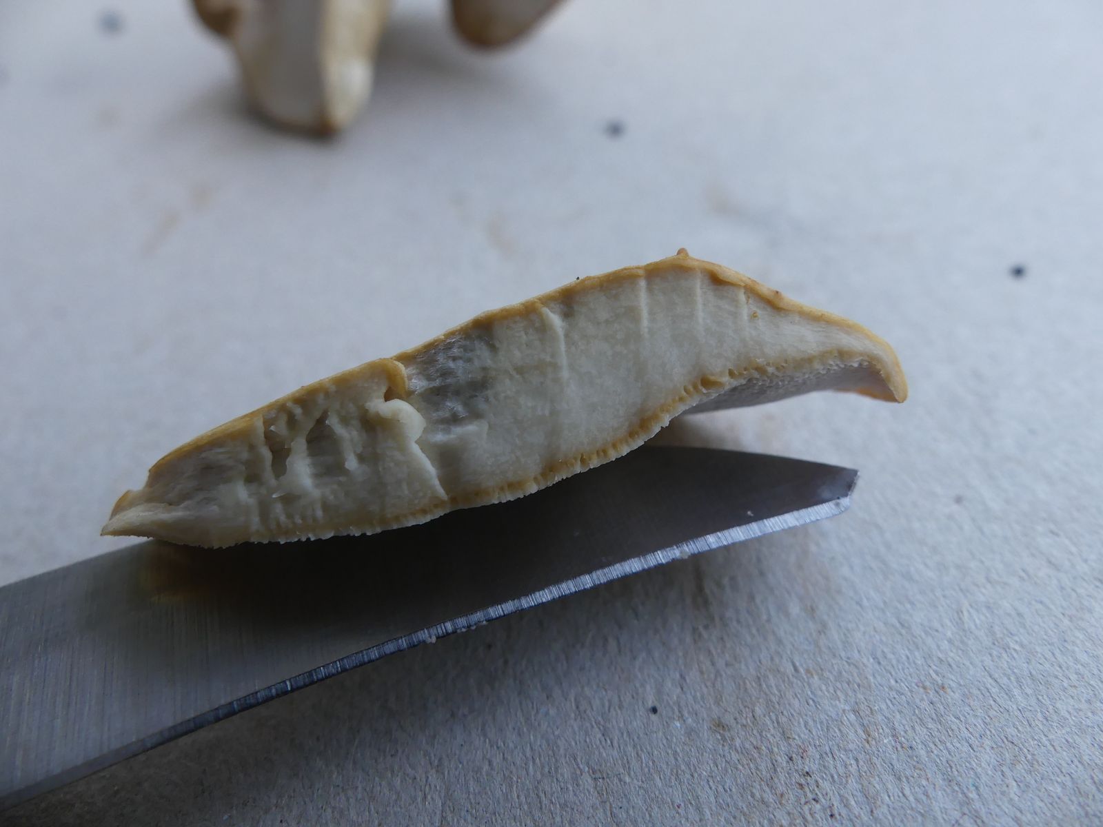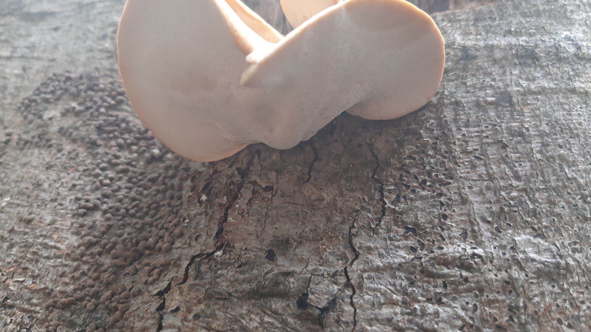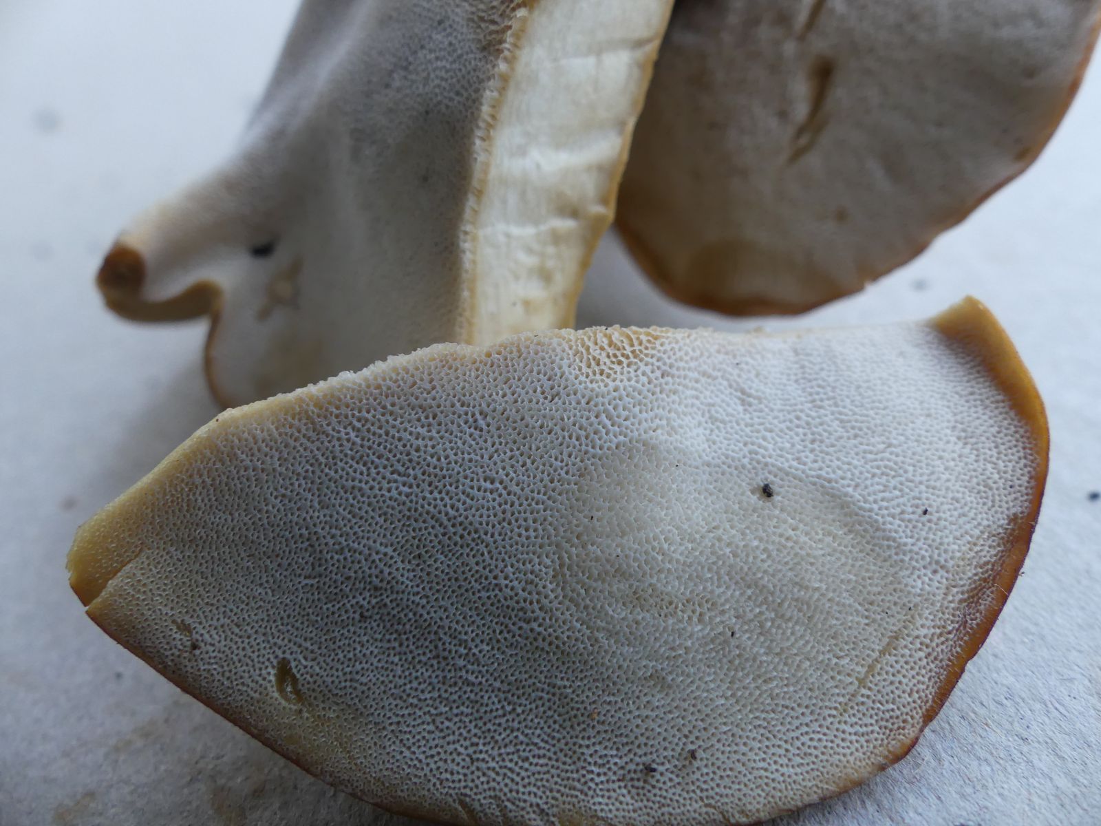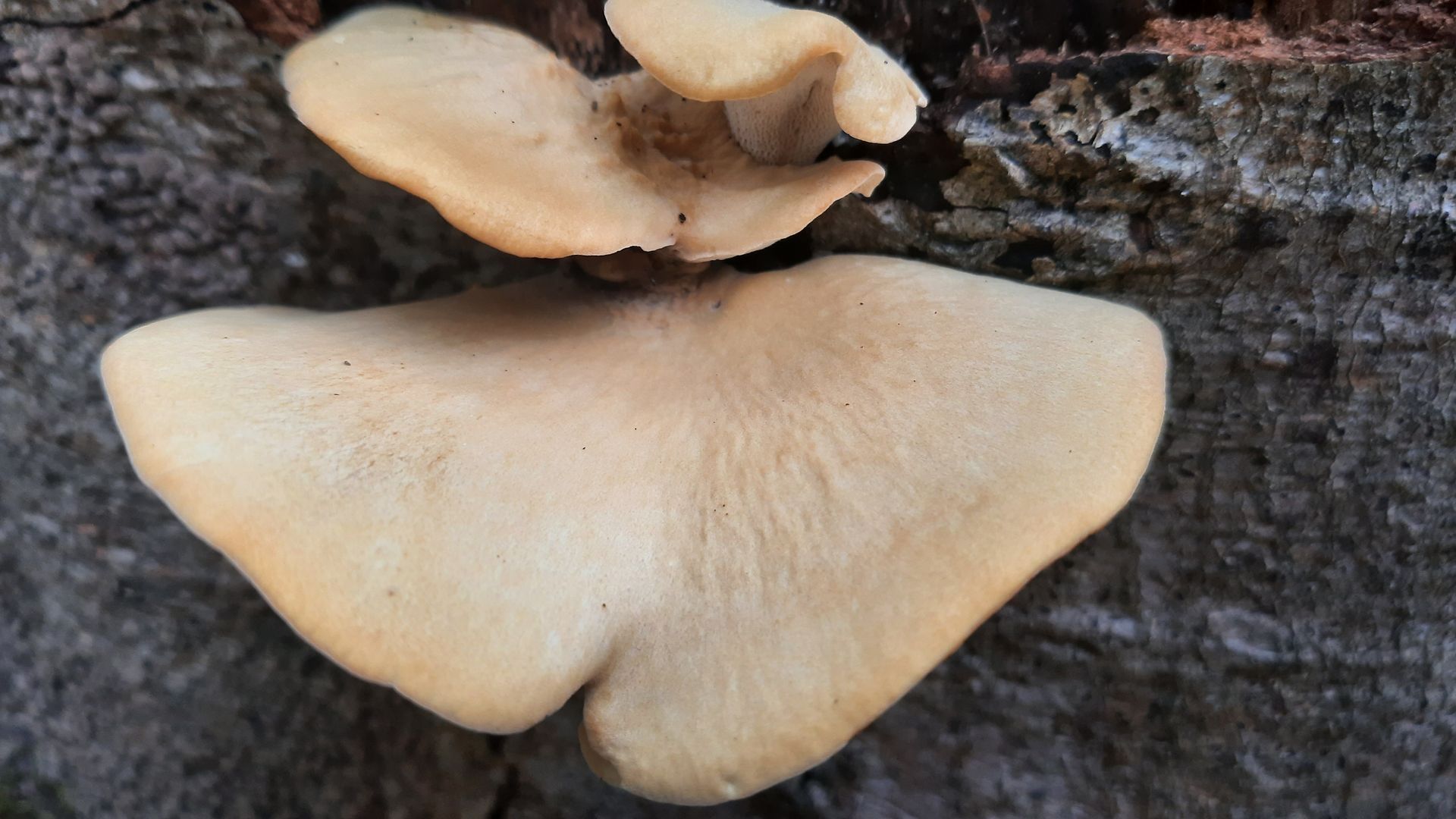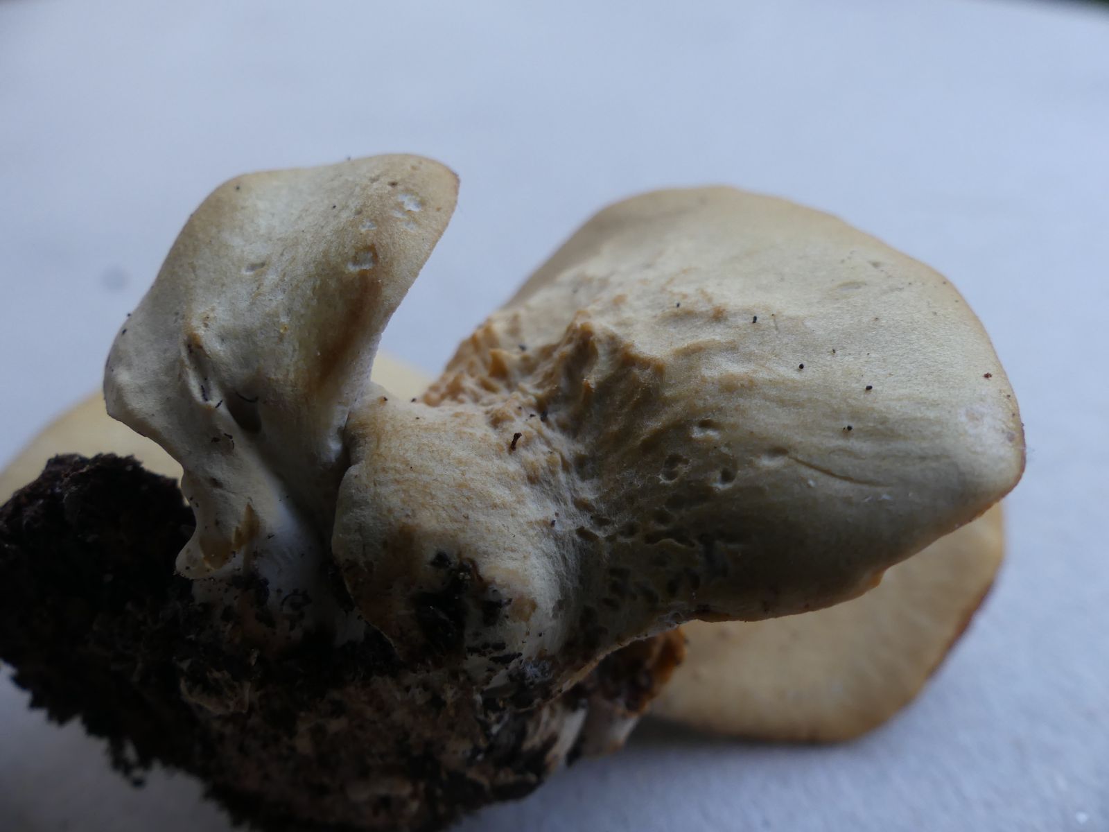 heute war ich im Eichen-Buchen-Kiefern-Mischwald unterwegs. An einem Buchenstumpf konnte ich diesen augenscheinlich noch recht jungen Porling finden, den ich nicht identifizieren kann. Markant ist die etwas runzelig-zerfurchte Oberfläche und der angenehm bis schwach würzige Geruch, den ich irgendwo zwischen frisch angeschnittenen Steinpilz mit einer kleinen Prise Krause Glucke beschreiben würde. Breiteste Stelle ca. 8 cm, Dicke der Fruchtkörper knapp 1 cm.