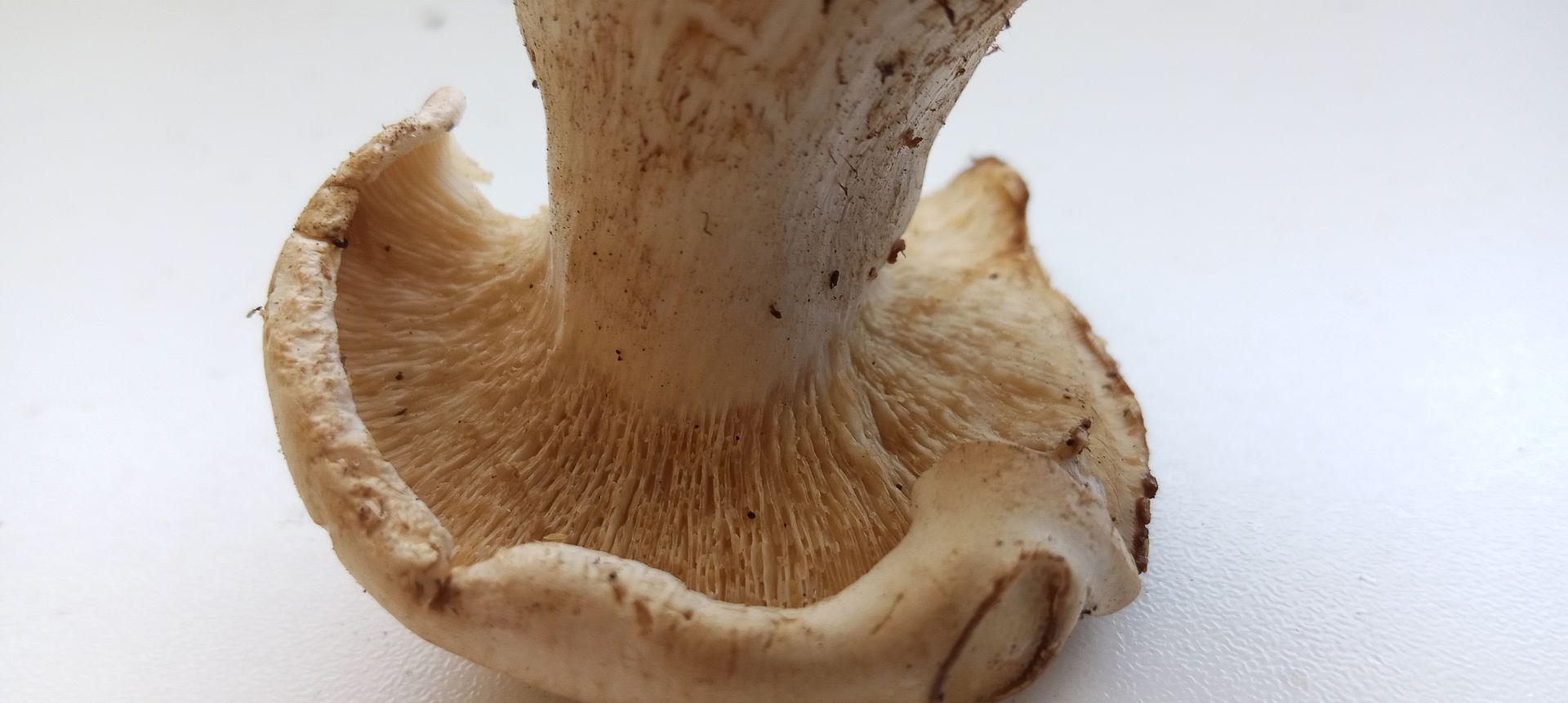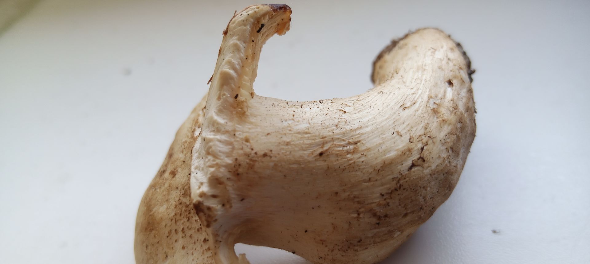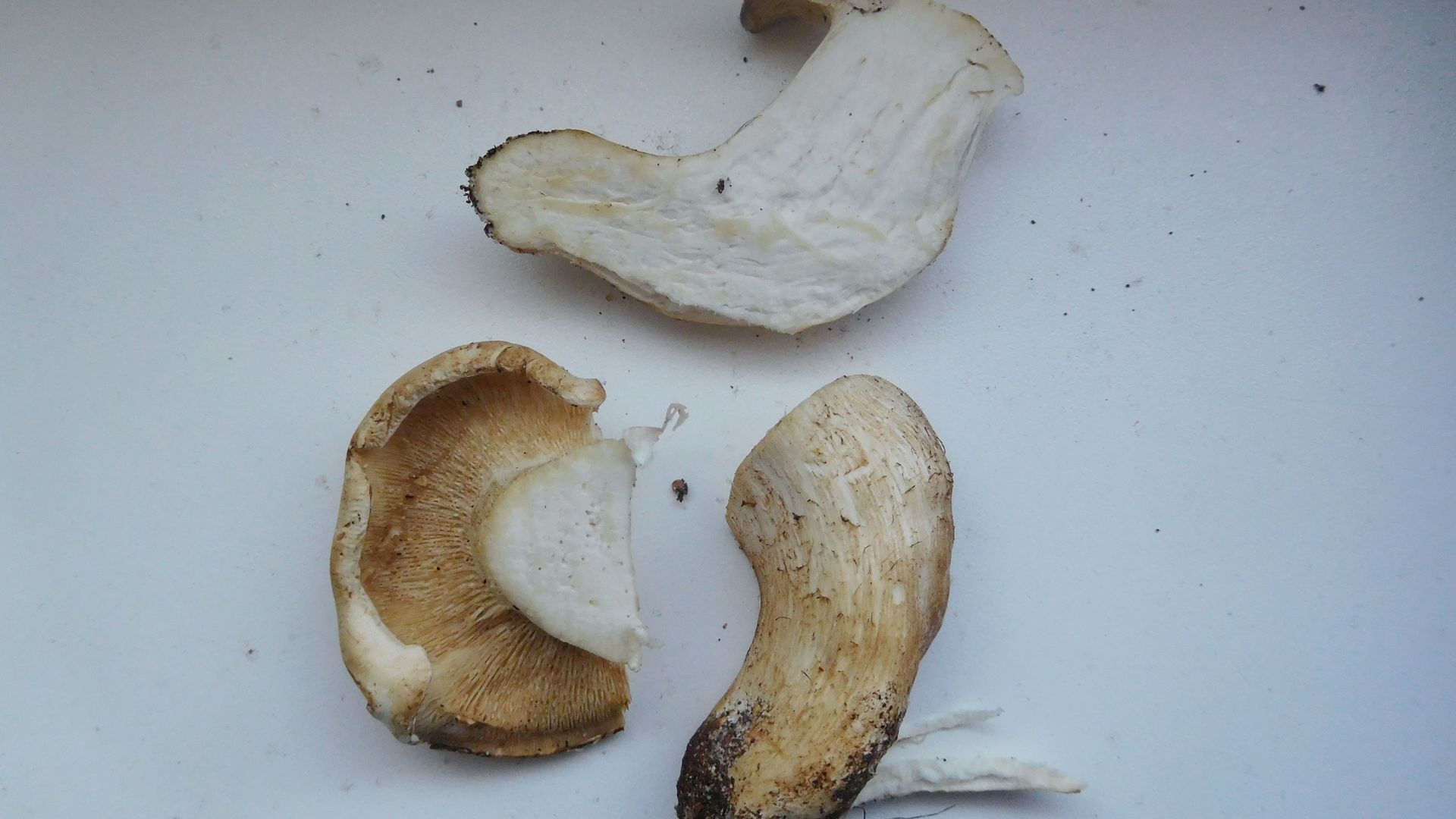 Der Stiel war sehr fest. Am Hut winzige Schuppen. Geruch süßsäuerlich, schwer zu definieren. Ich bin gedanklich bei Sägeblättlingen. Aber irgendwie passt es nicht wirklich, angefangen vom angeblichen Wachstum auf Waldboden (natürlich können Wurzel im Boden sein). Hat jemand eine bessere Idee?