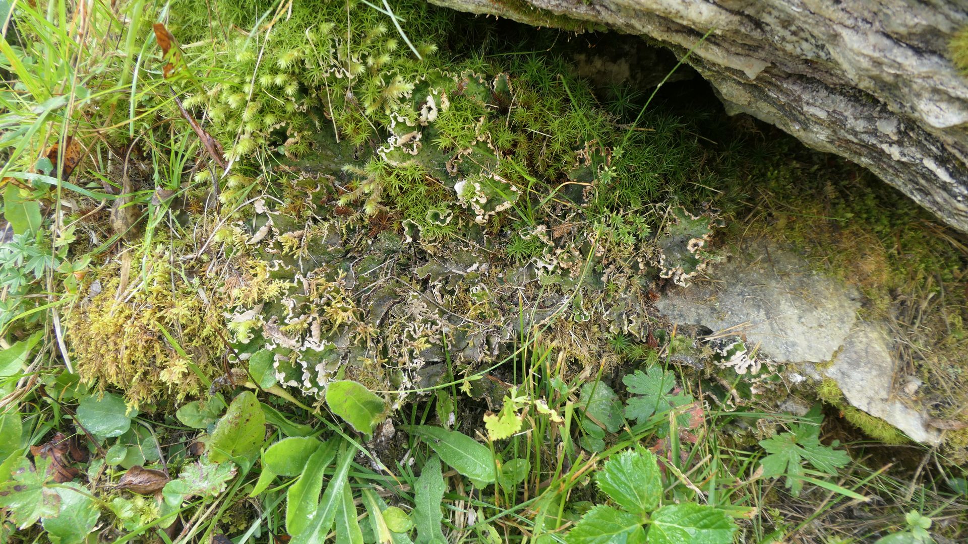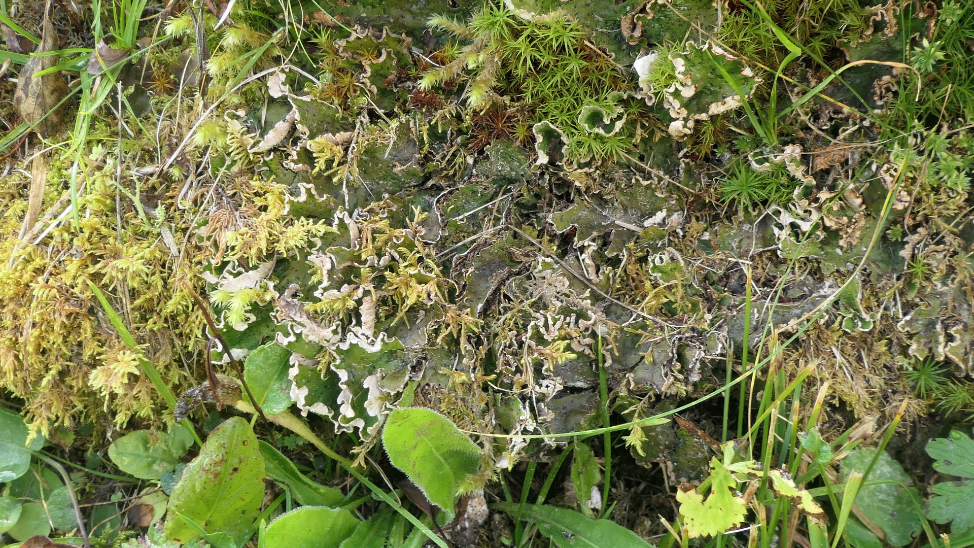 Die Flechten sind hier eingebettet in Moospolster über Schiefer.