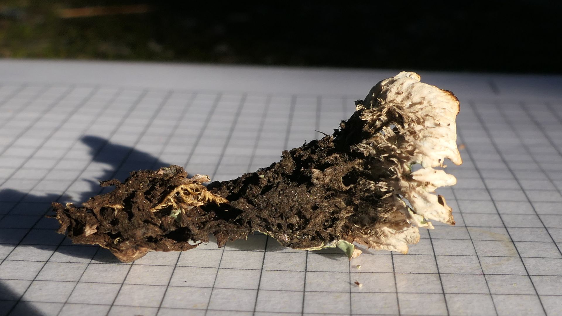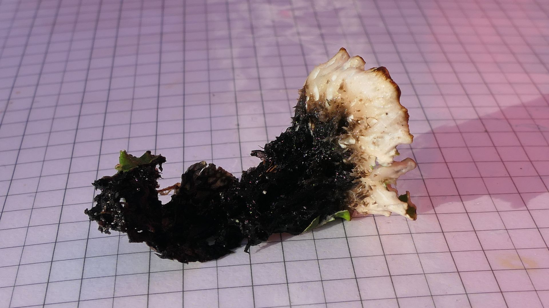 Bild 21 Unterseite mit schwarzem Filz in der Mitte, heller Rand mit büscheligen Rhizinien (trockener Zustand)