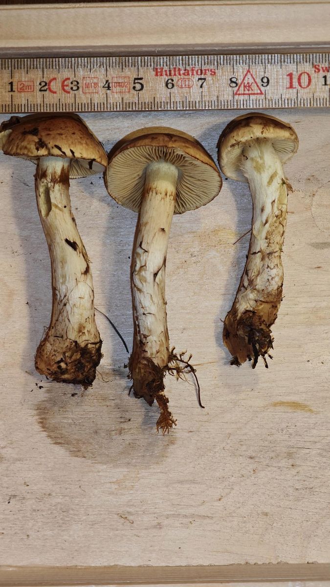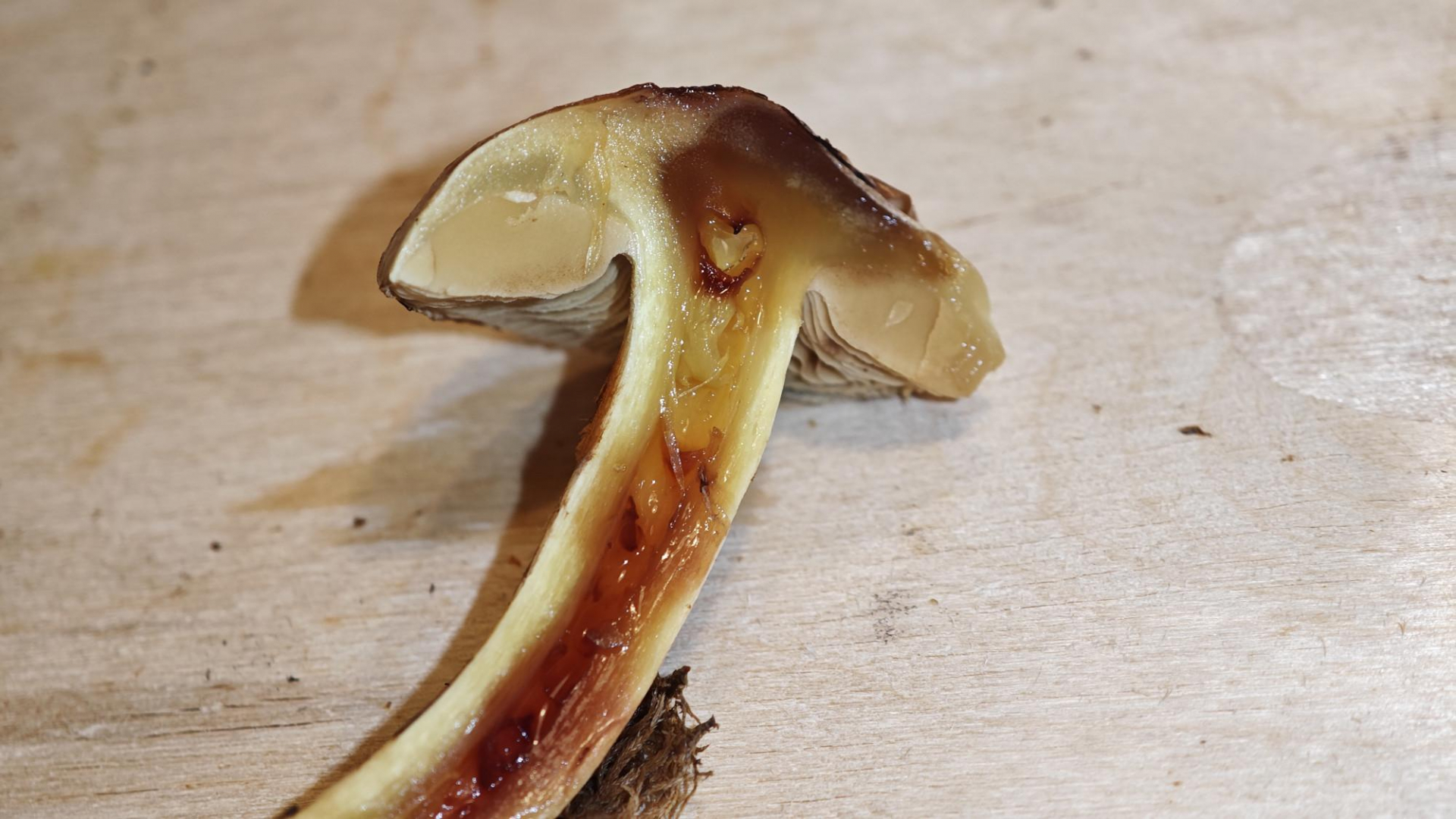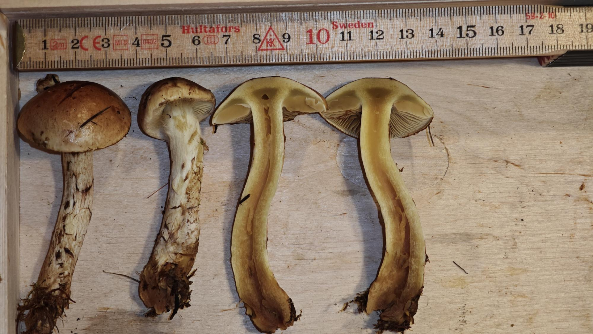 Was mir bei diesem Schleimkopf direkt auffiel waren seine dunkleren Velumgürtel und dann später zuhause sein extrem aufdringlicher, meiner Meinung nach erdig muffiger Geruch. Der Geruch ist so penetrant, dass, wenn man einen Pilz in einem Raum liegen lässt, der ganze Raum diesen erdartigen, muffigen Geruch annimmt. Ich habe beim Bestimmungsversuch zunächst mal in den Kibby geschaut und fand dort Cortinarius mussivus. Allerdings schien dieser Pilz eher etwas grösser zu sein. Des Weiteren fand ich noch Cortinarius nanceiensis, dort passte aber der Geruch überhaupt nicht. Also habe ich mal in den Ludwig geschaut und im Bildband Cortinarius mussivus gesucht. Dieser schien mir aber im Habitus deutlich kräftiger zu sein, als mein Fund, aber direkt daneben habe ich einen Pilz gesehen, der optisch wirklich perfekt zu meinem Fund zu passen schien und dann habe ich noch den Namen gelesen Cortinarius russeoides - Stinkender Fichten-Schleimkopf und ich dachte mir, Volltreffer. ![]()