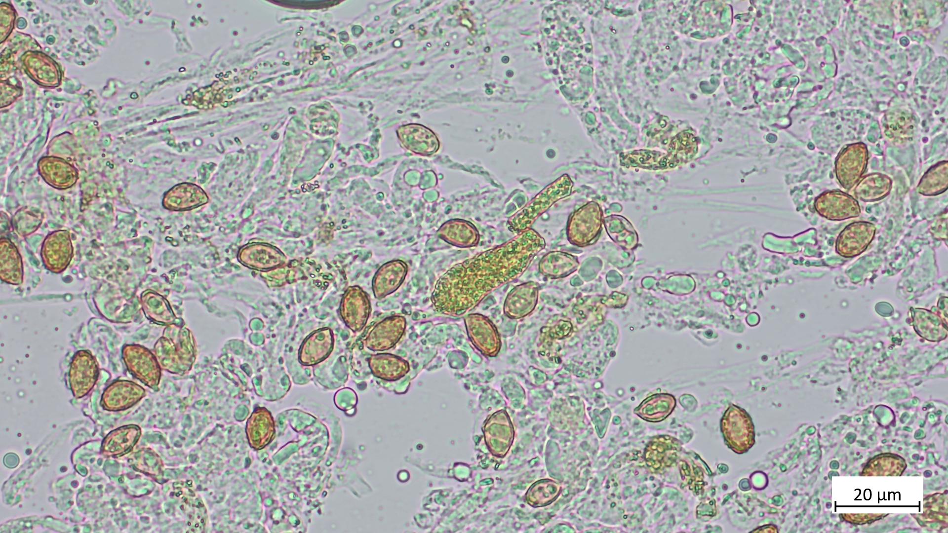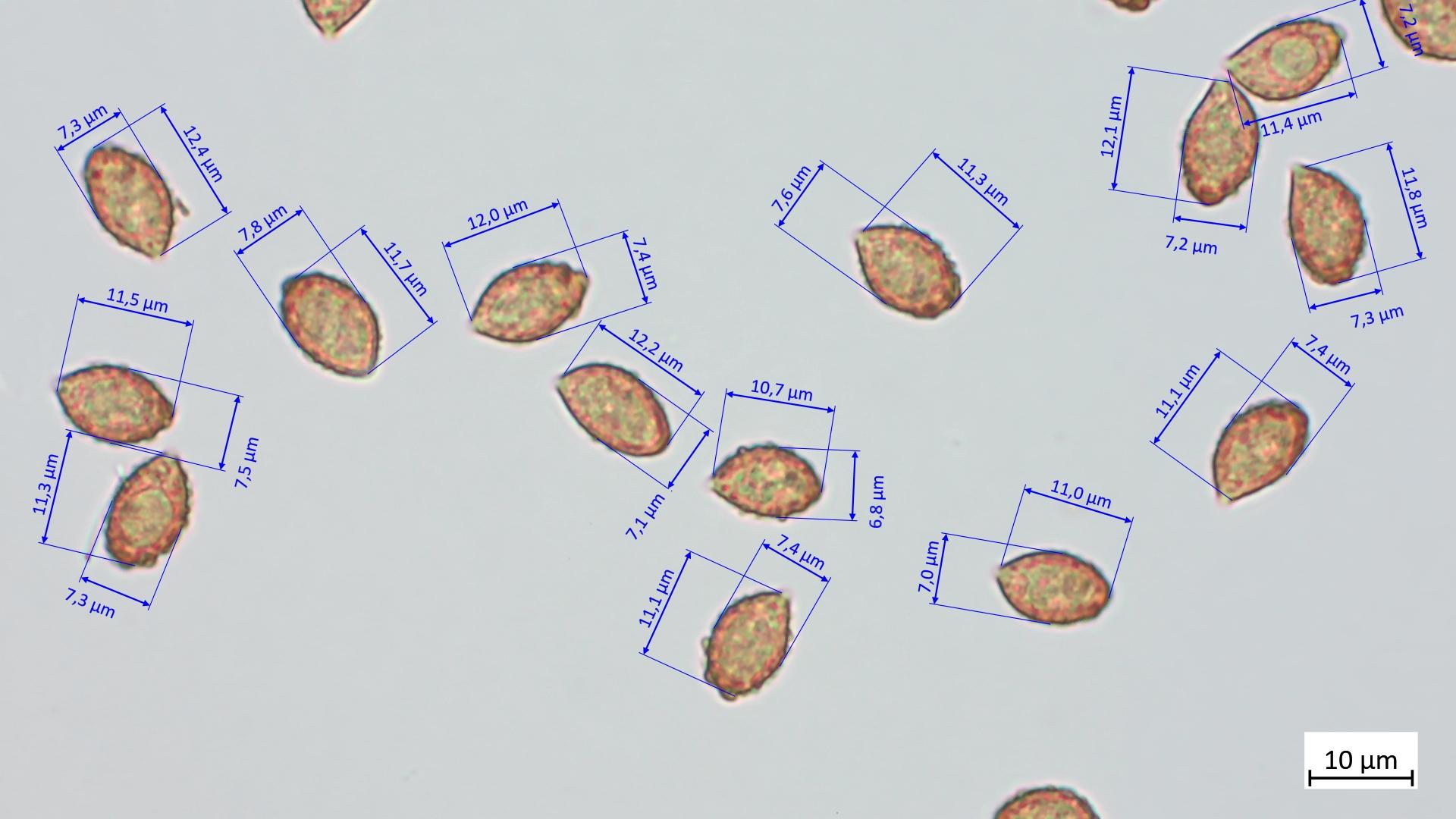 Ich habe 36 Sporen gemessen: 11.5 µm (10.3 - 12.6 µm) x 7.3 (6.8 - 7.8 µm), Q = 1.57 (1.43 - 1.75):