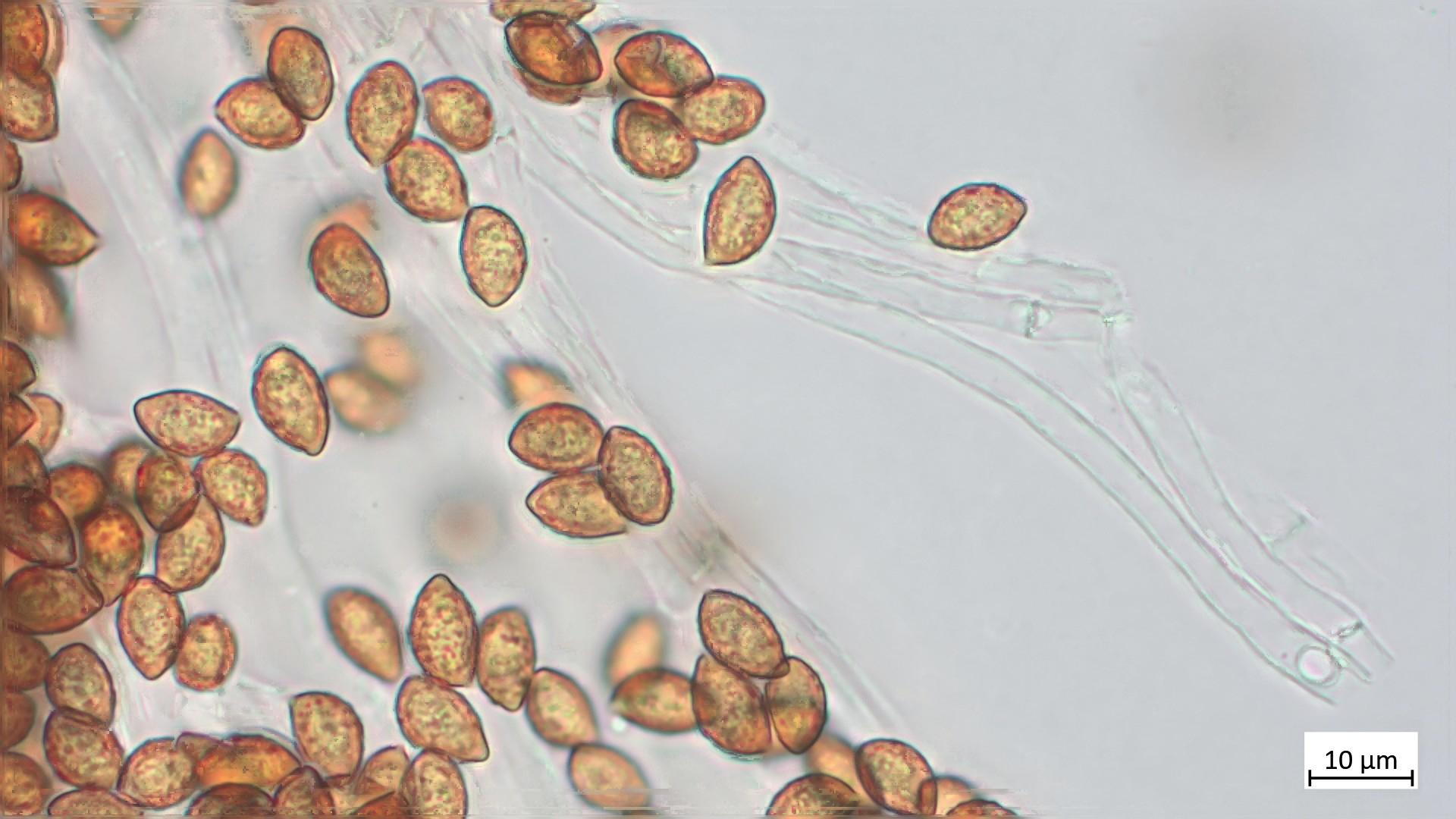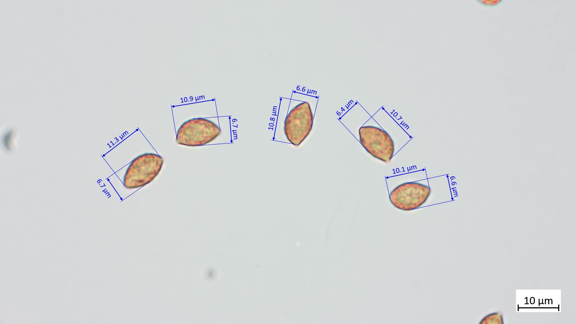 Ich habe 30 Sporen gemessen: 10.5 µm (9.8 - 11.7 µm) x 6.5 (6.0 - 7.1 µm), Q = 1.62 (1.50 - 1.75):