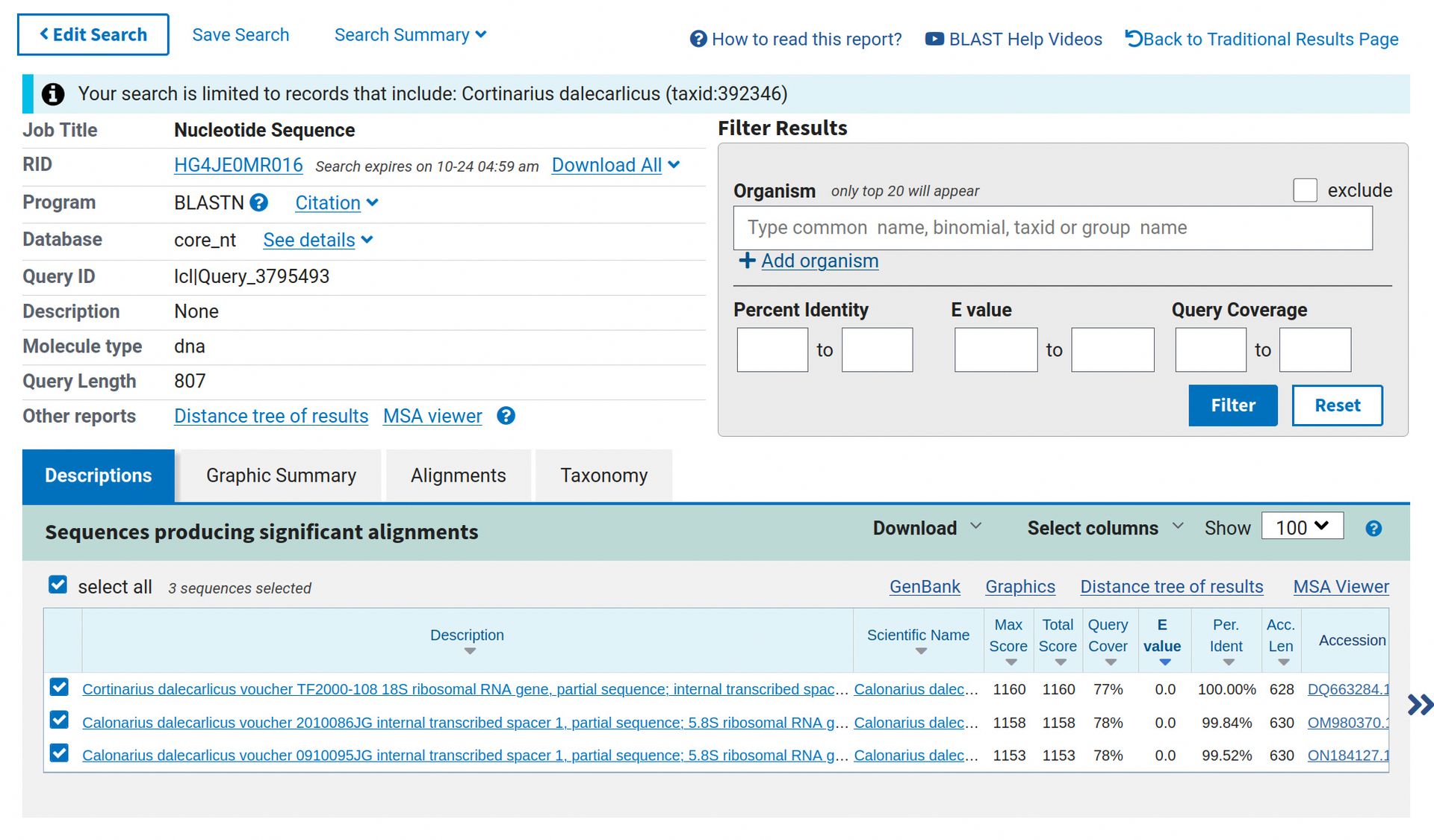 Wie nicht anders erwartet, hat die Sequenzierung die Einschätzung von Günter, die auch morphologisch wie die Faust aufs Auge gepasst hat, bestätigt. Bei der NIH passt der Per. Ident Wert bei einer Probe zu 100%, aber der Query Cover ist mit 77 bis 78% etwas tief: