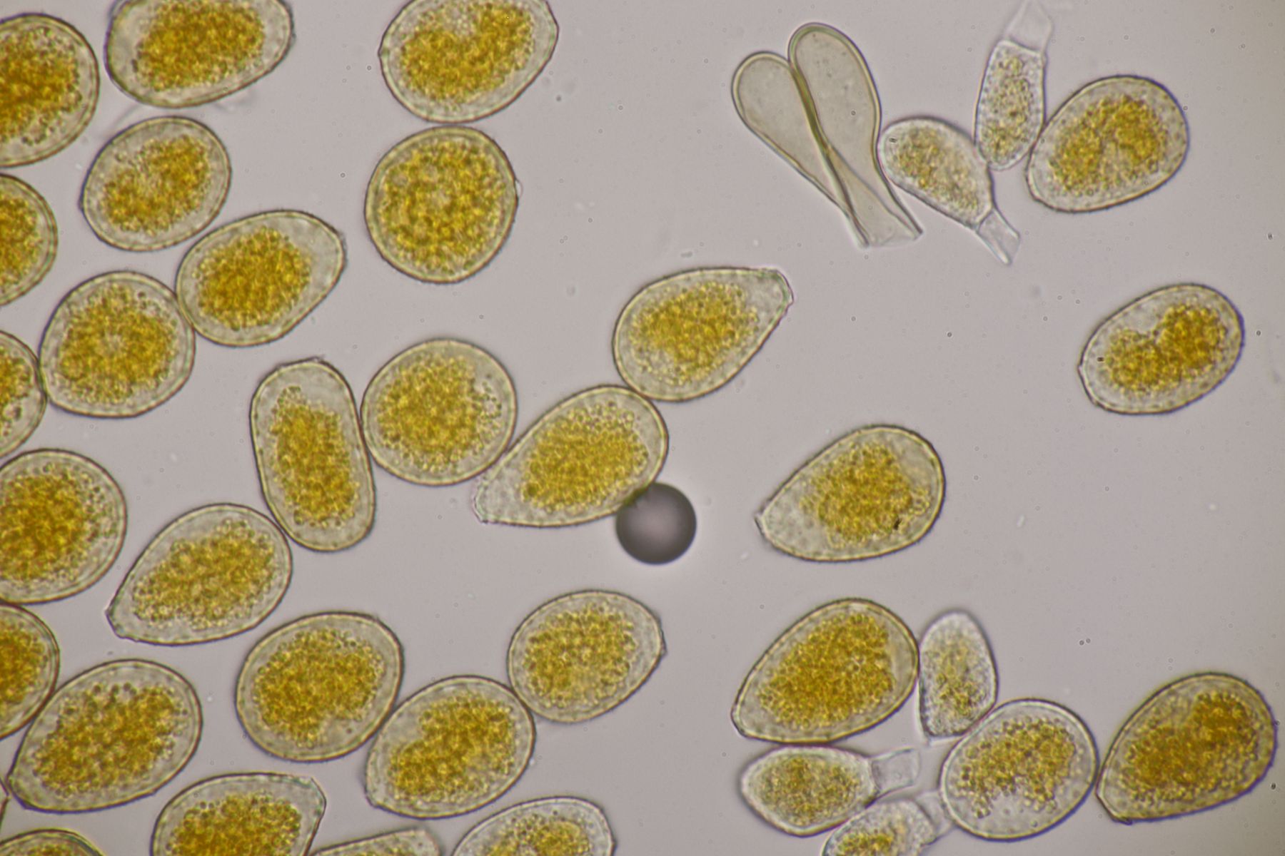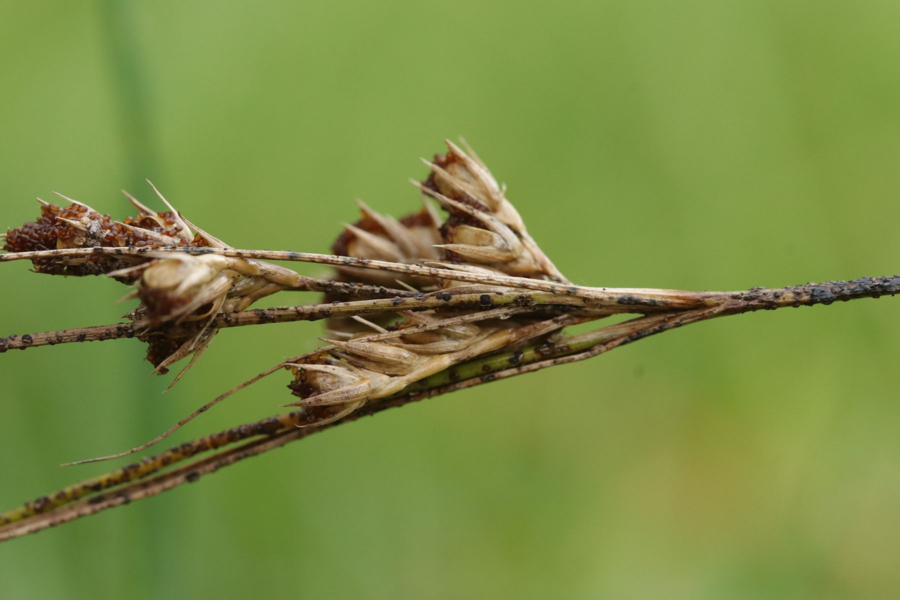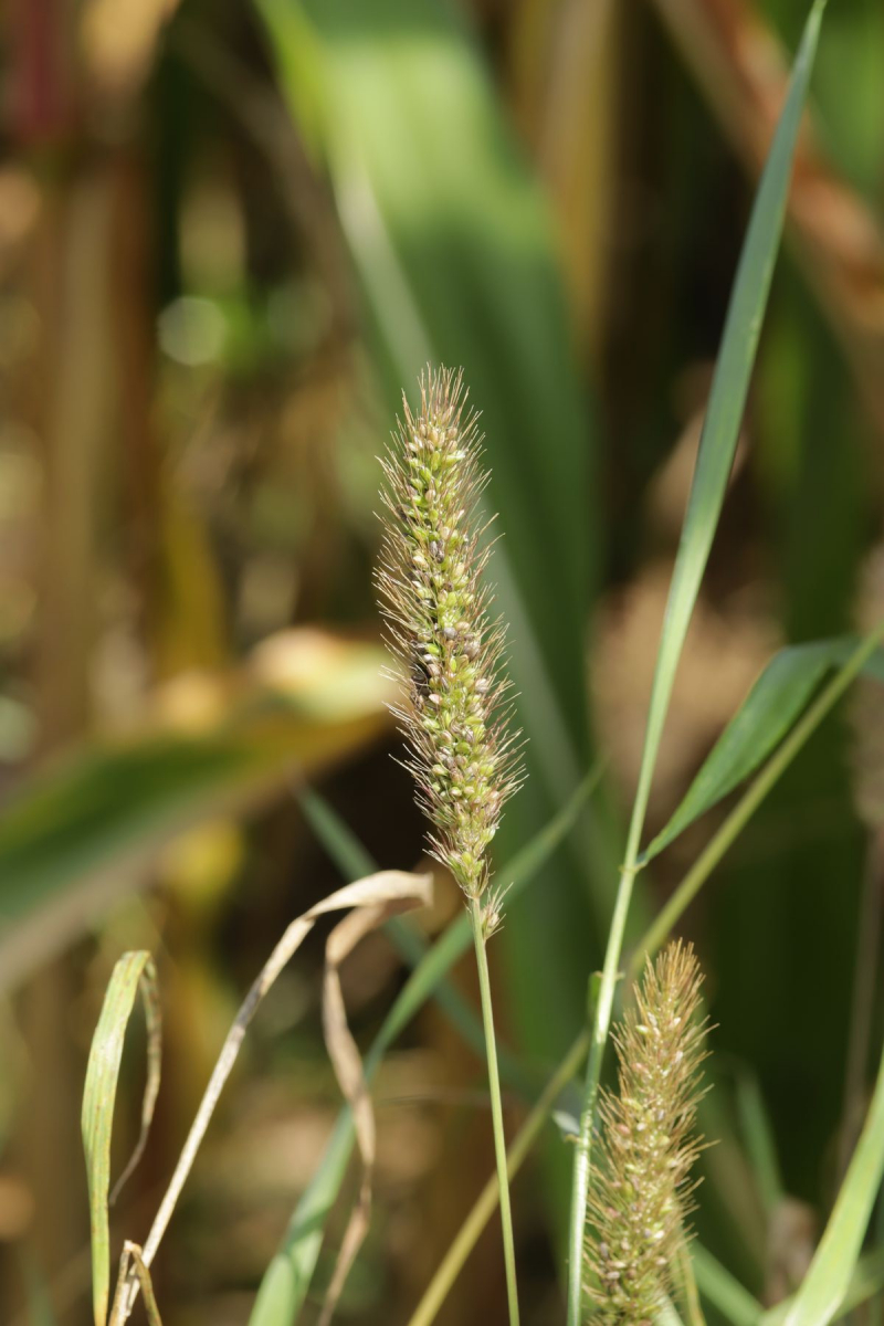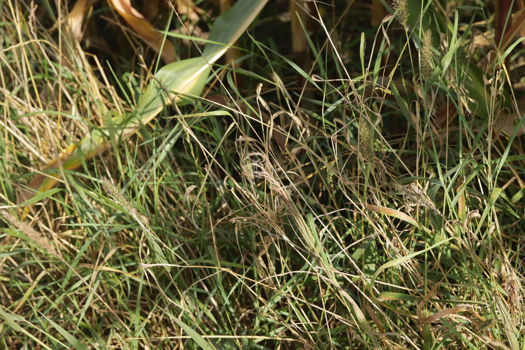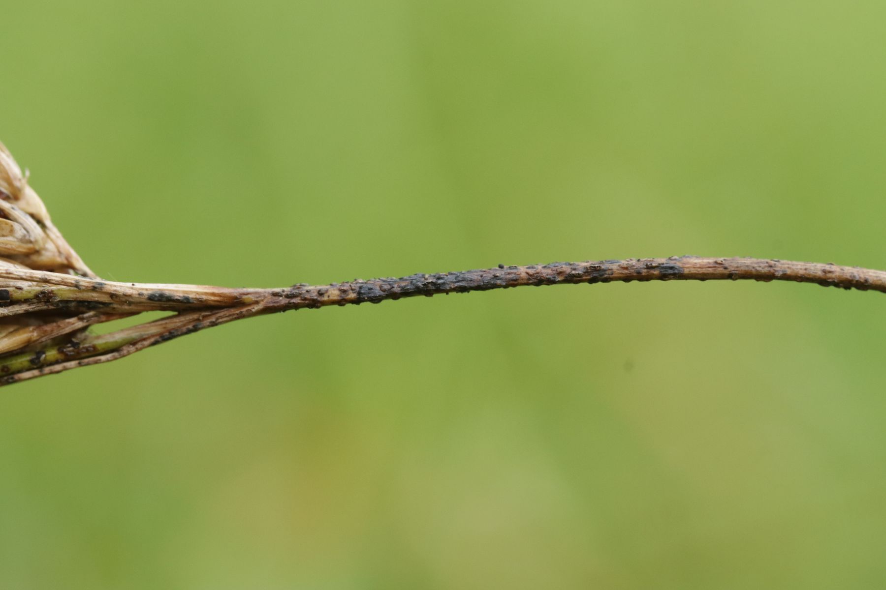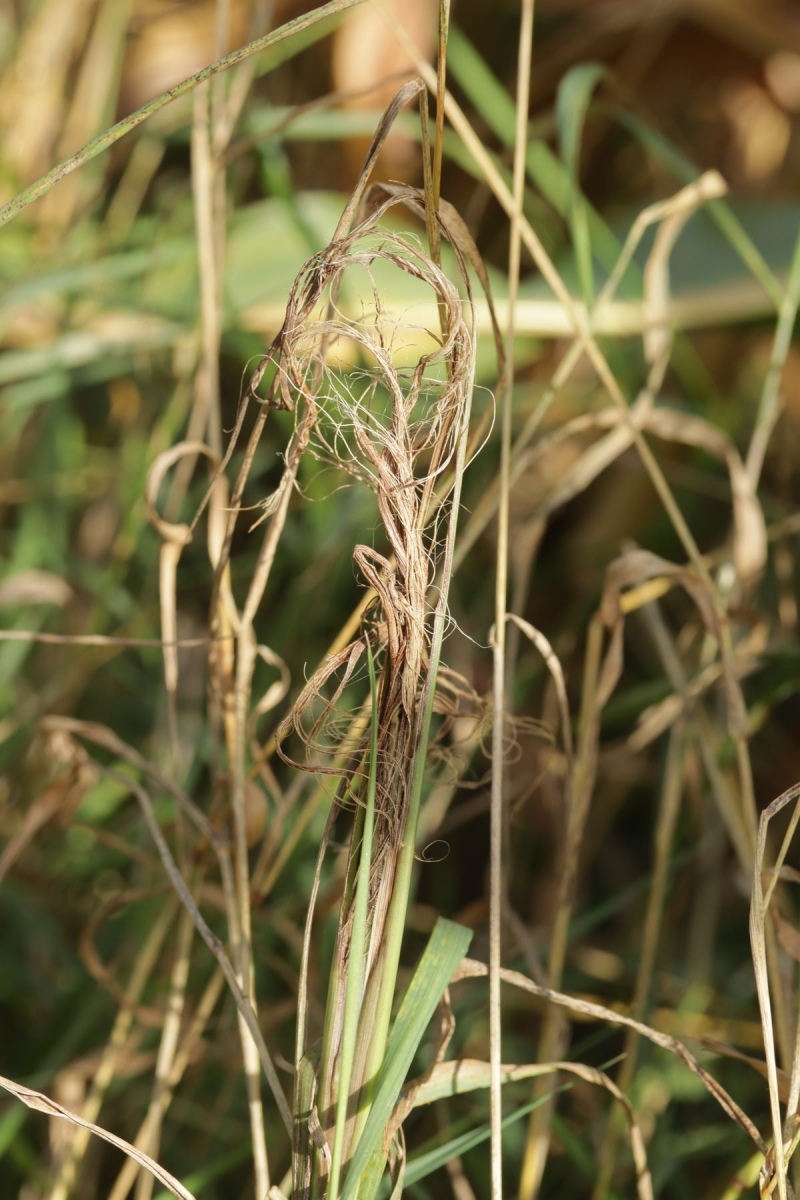 10. Sclerospora graminicola ex Setaria viridis. Hier hat der falsche Mehltau die Blütenstände komplett befallen, so daß sie in der Blattscheide steckengeblieben sind und jetzt zum Ende der Vegetationsperiode voll mit Oosporen sind.