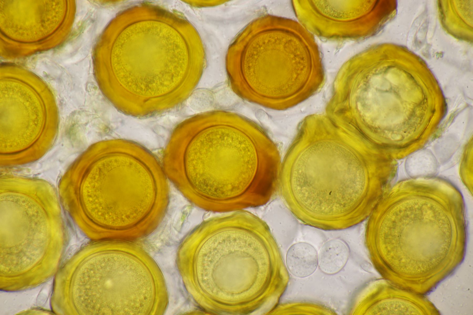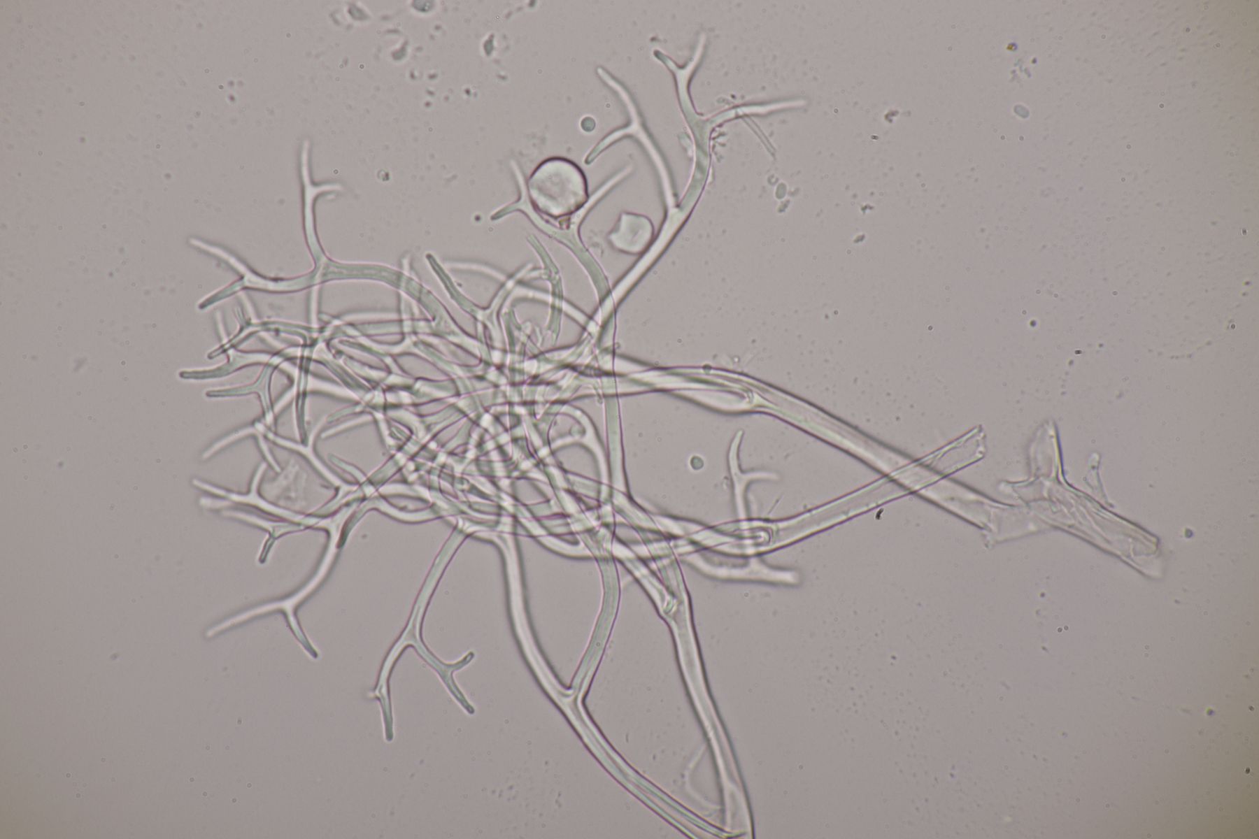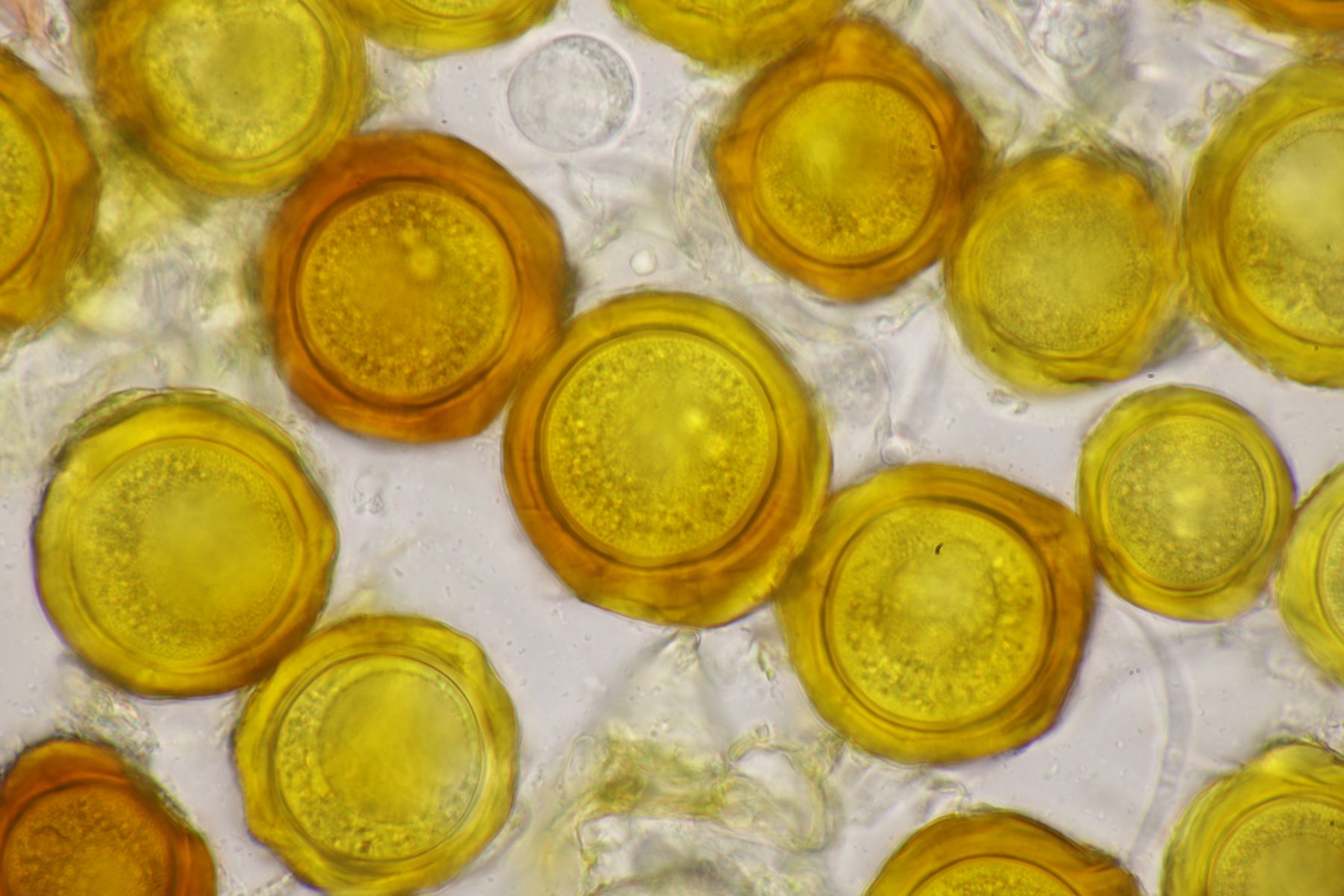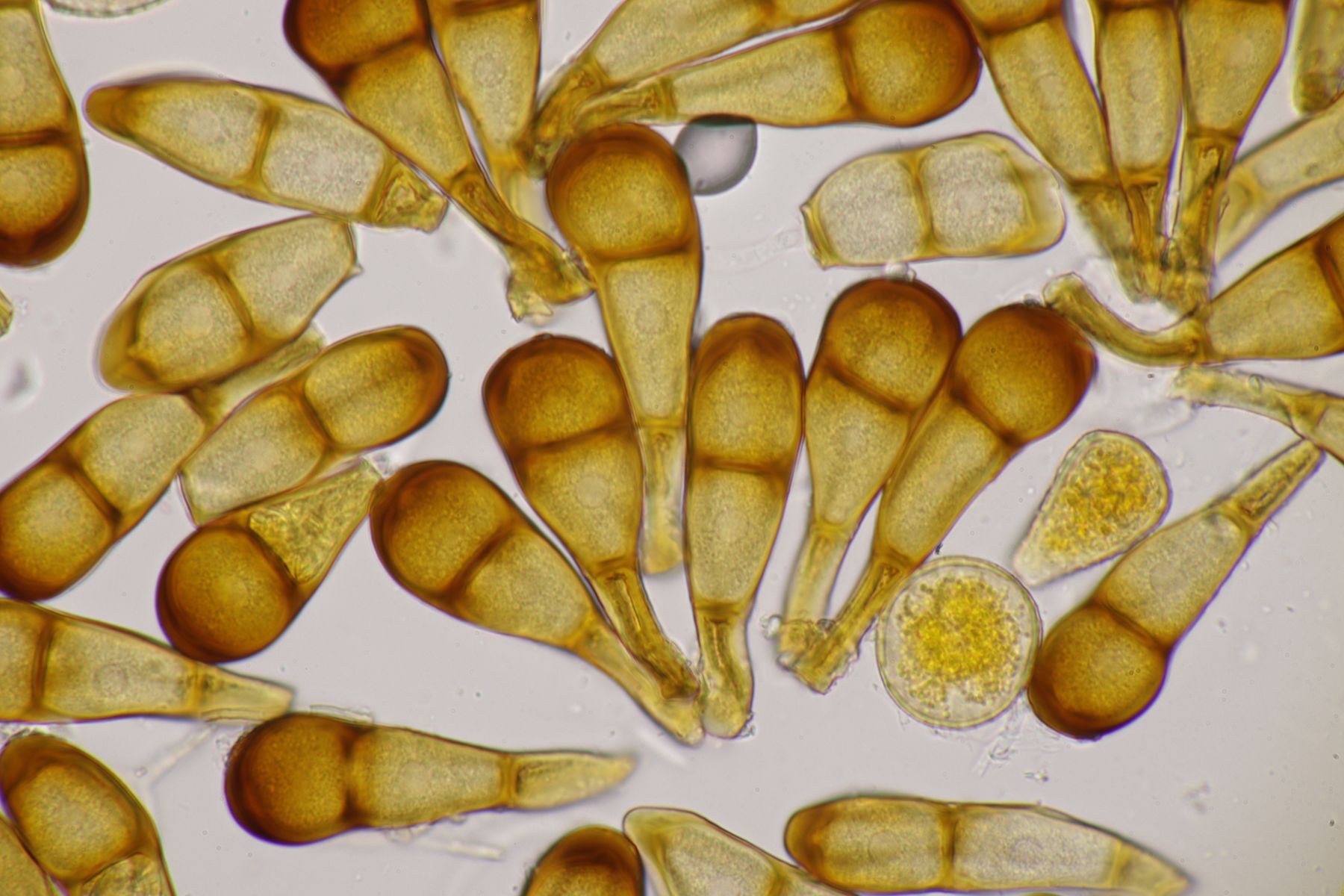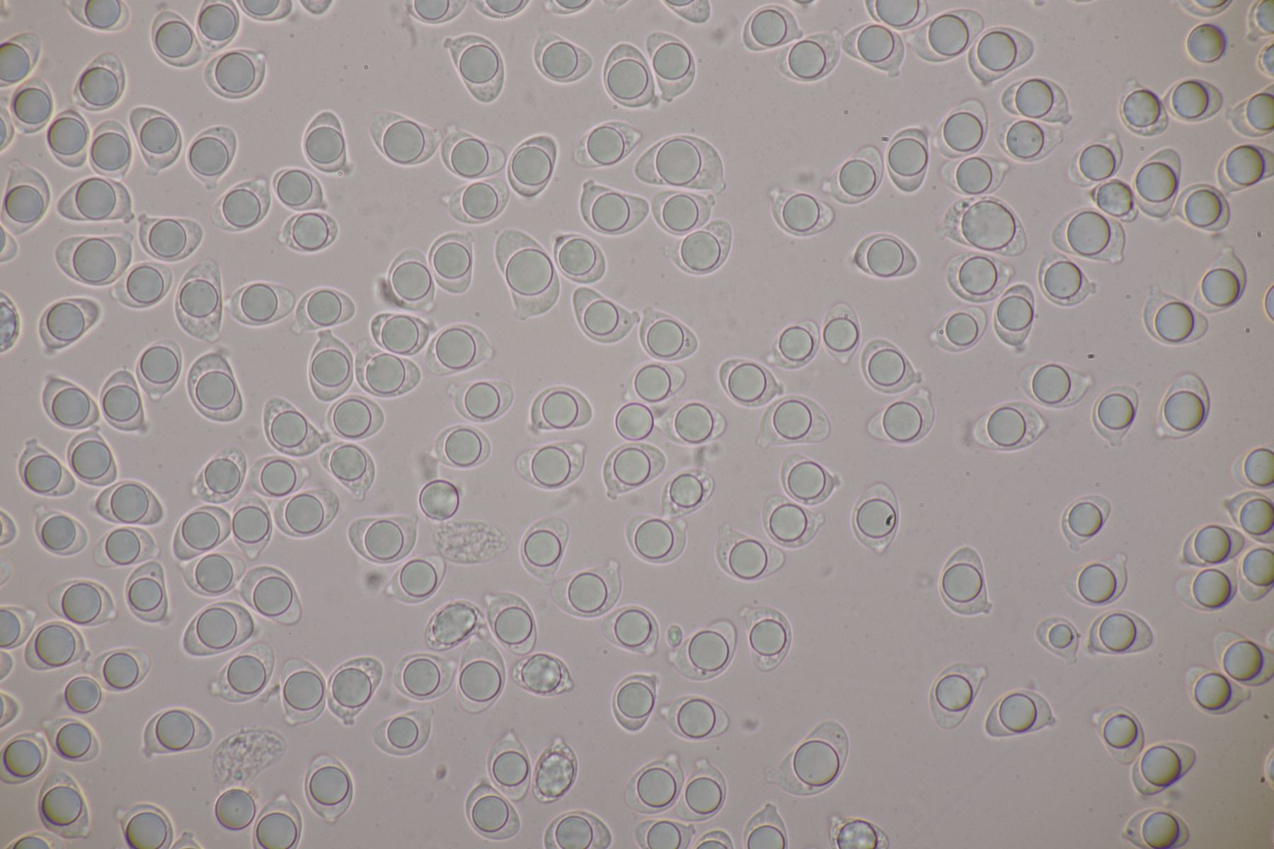 10. Sclerospora graminicola ex Setaria viridis. Hier hat der falsche Mehltau die Blütenstände komplett befallen, so daß sie in der Blattscheide steckengeblieben sind und jetzt zum Ende der Vegetationsperiode voll mit Oosporen sind.
