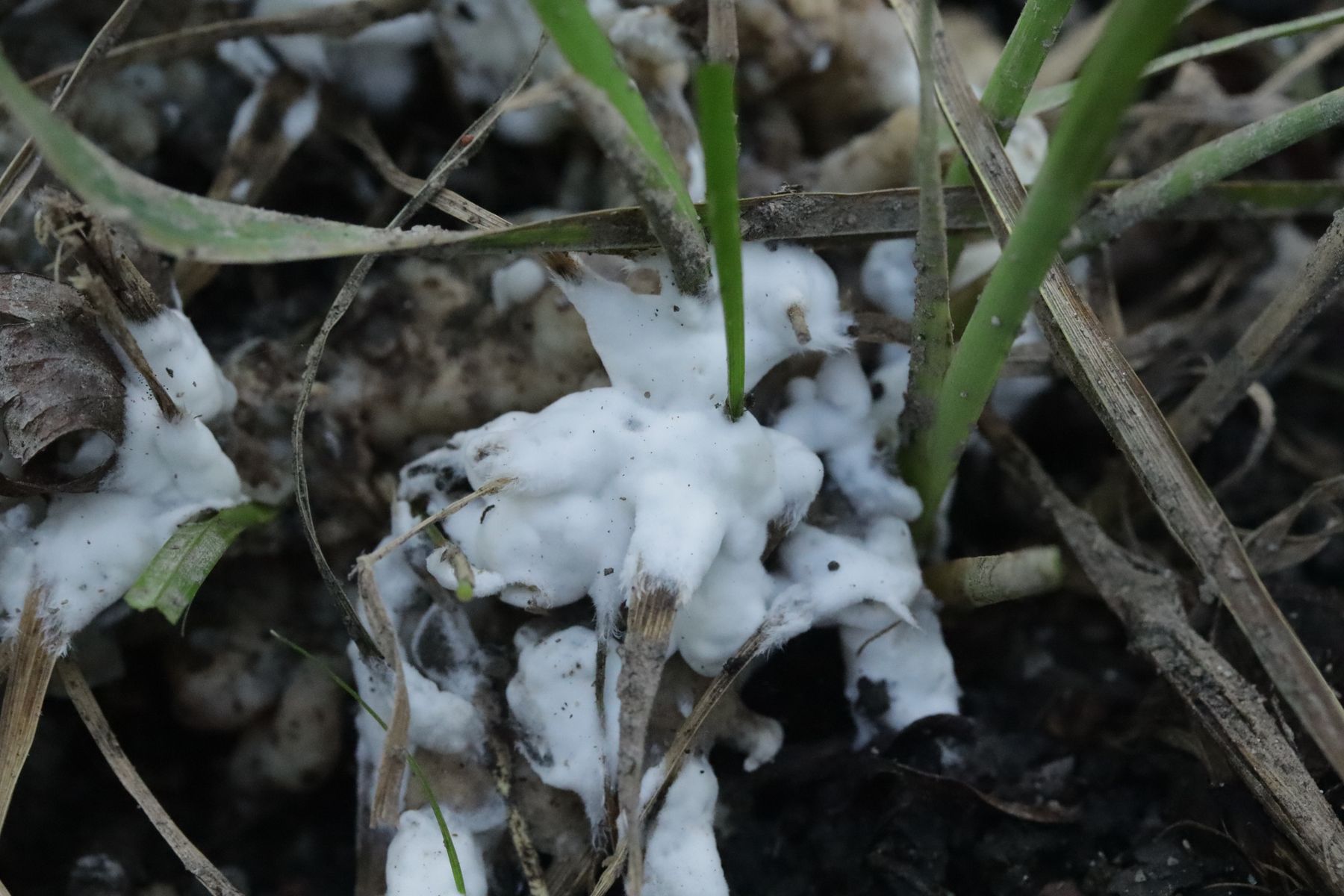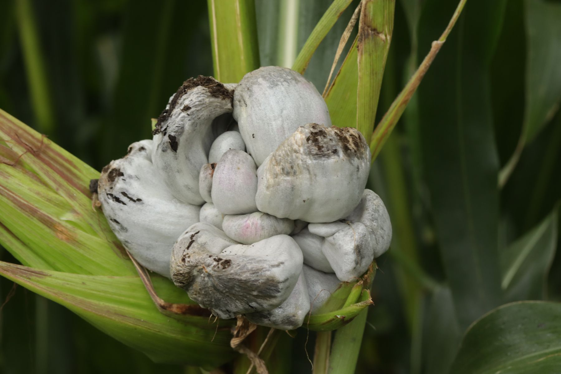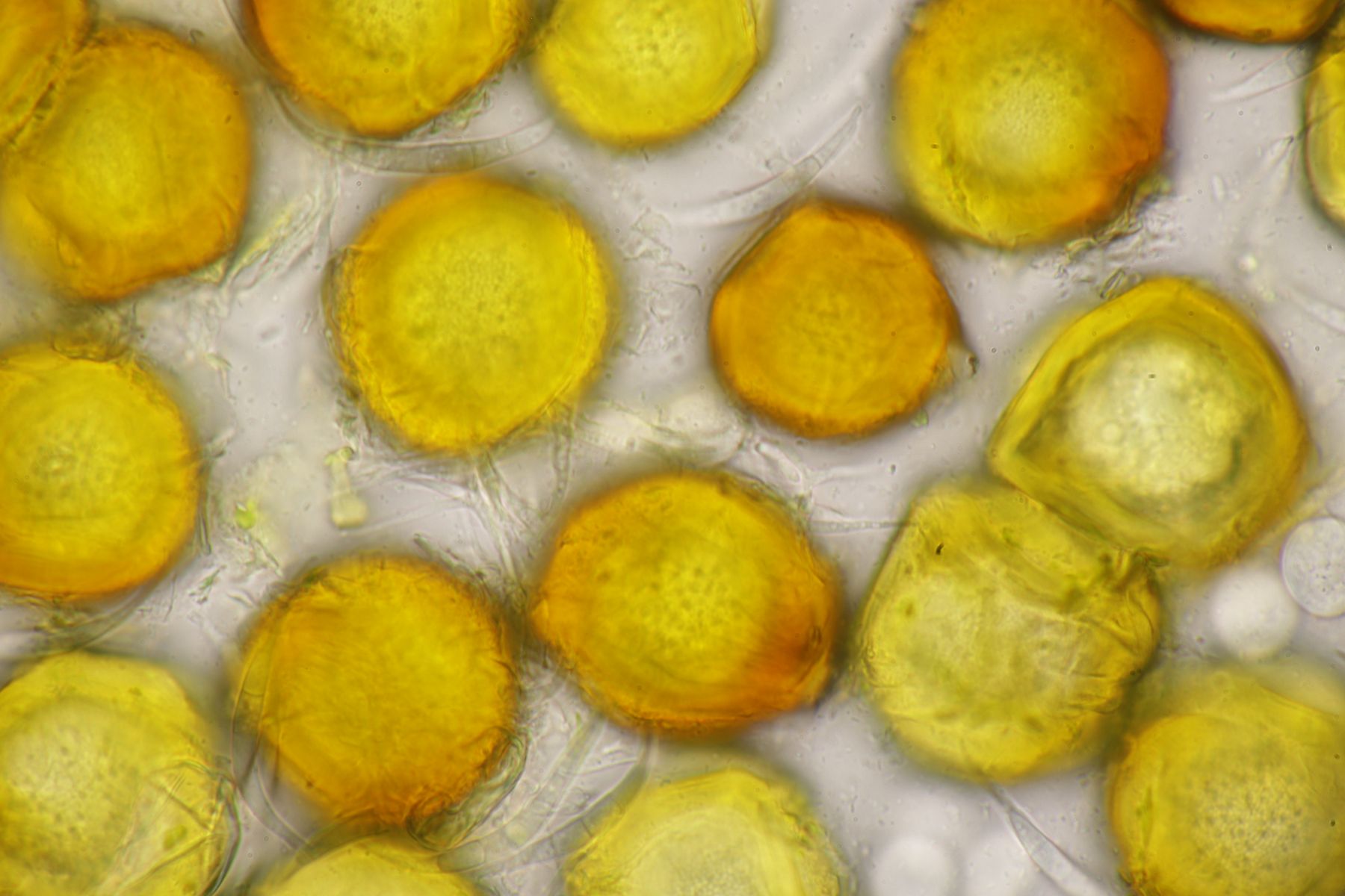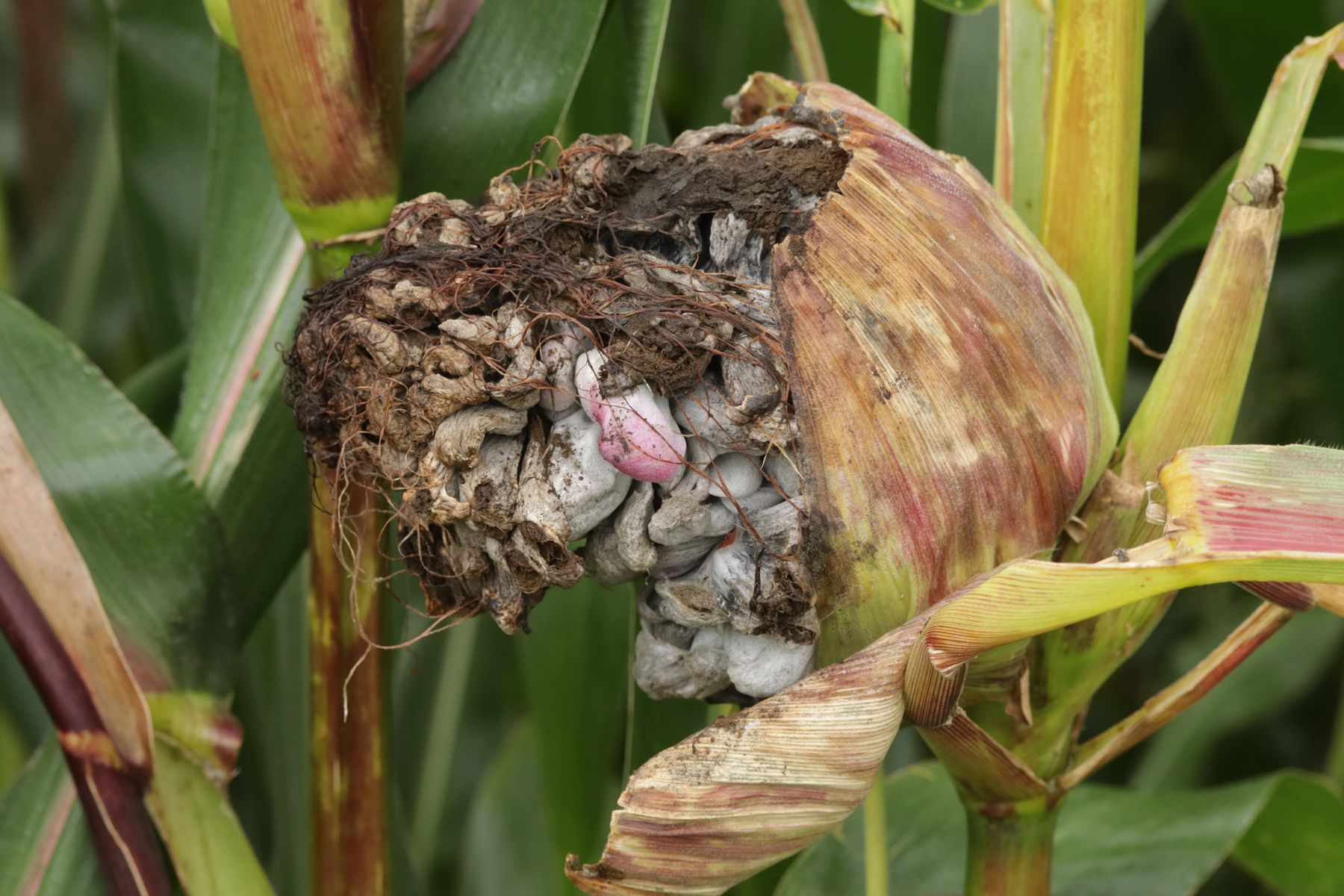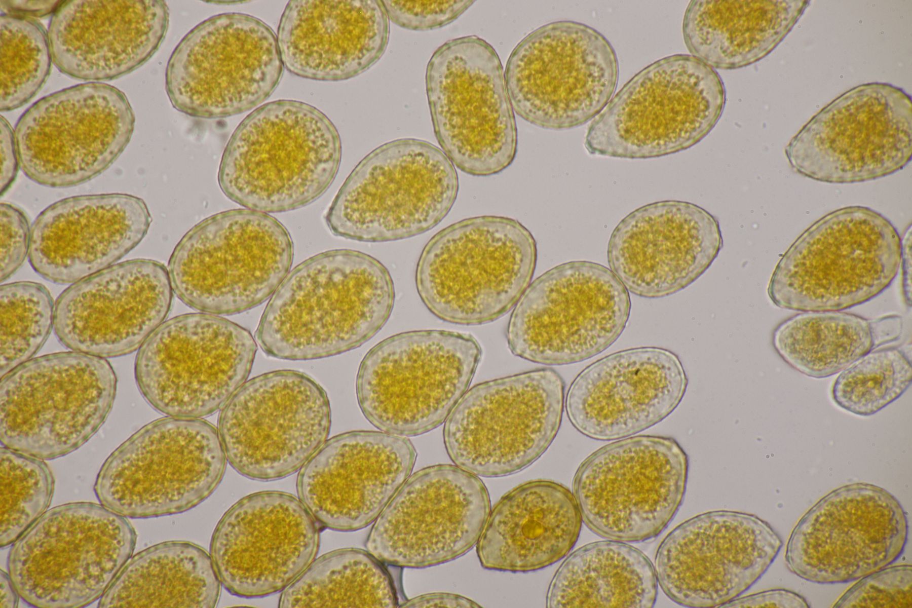 10. Sclerospora graminicola ex Setaria viridis. Hier hat der falsche Mehltau die Blütenstände komplett befallen, so daß sie in der Blattscheide steckengeblieben sind und jetzt zum Ende der Vegetationsperiode voll mit Oosporen sind.
