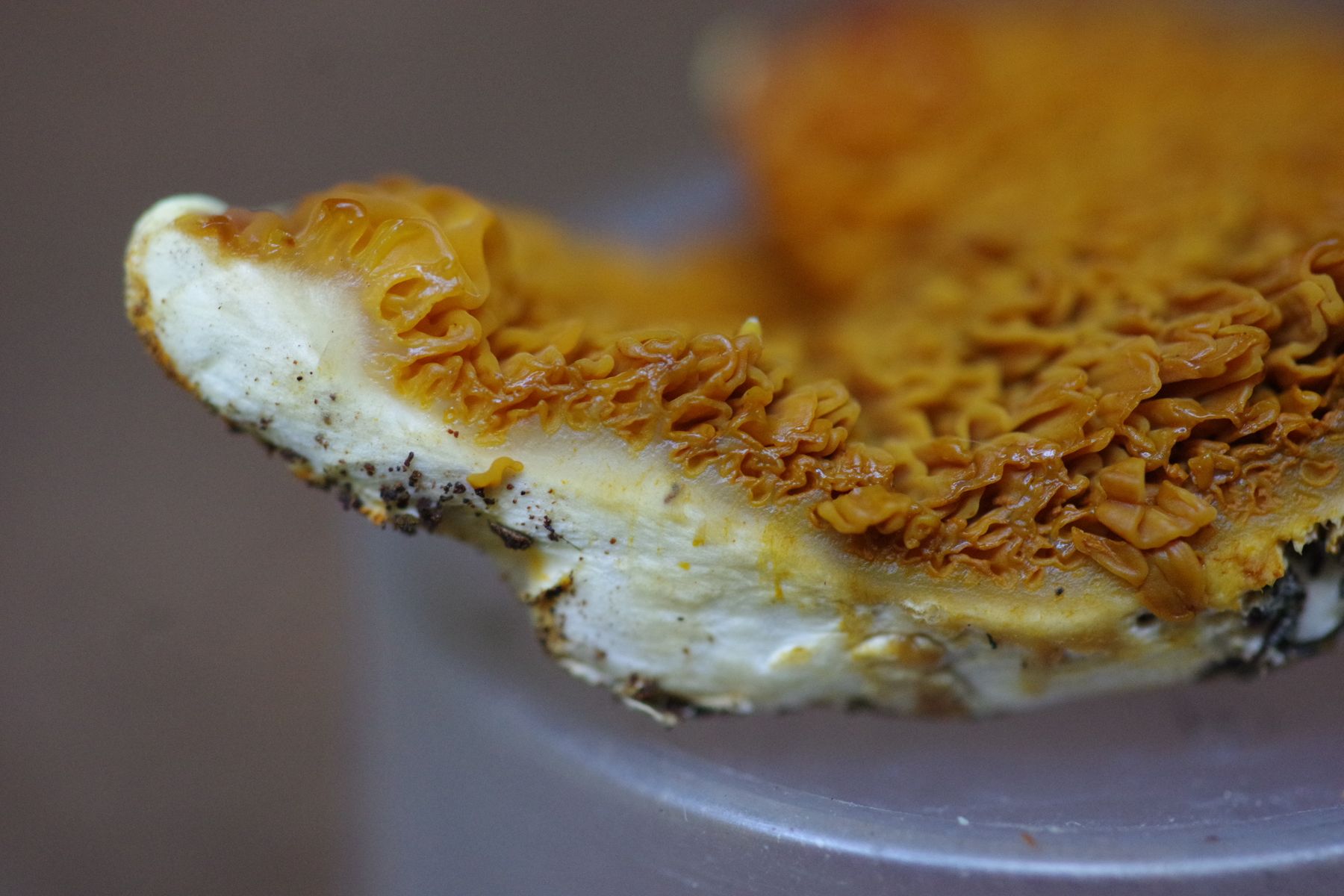 Farblich sehr auffällig, leuchtend gelb. Die Falten orange. Geruch pilzig mit leichter Anisnote.